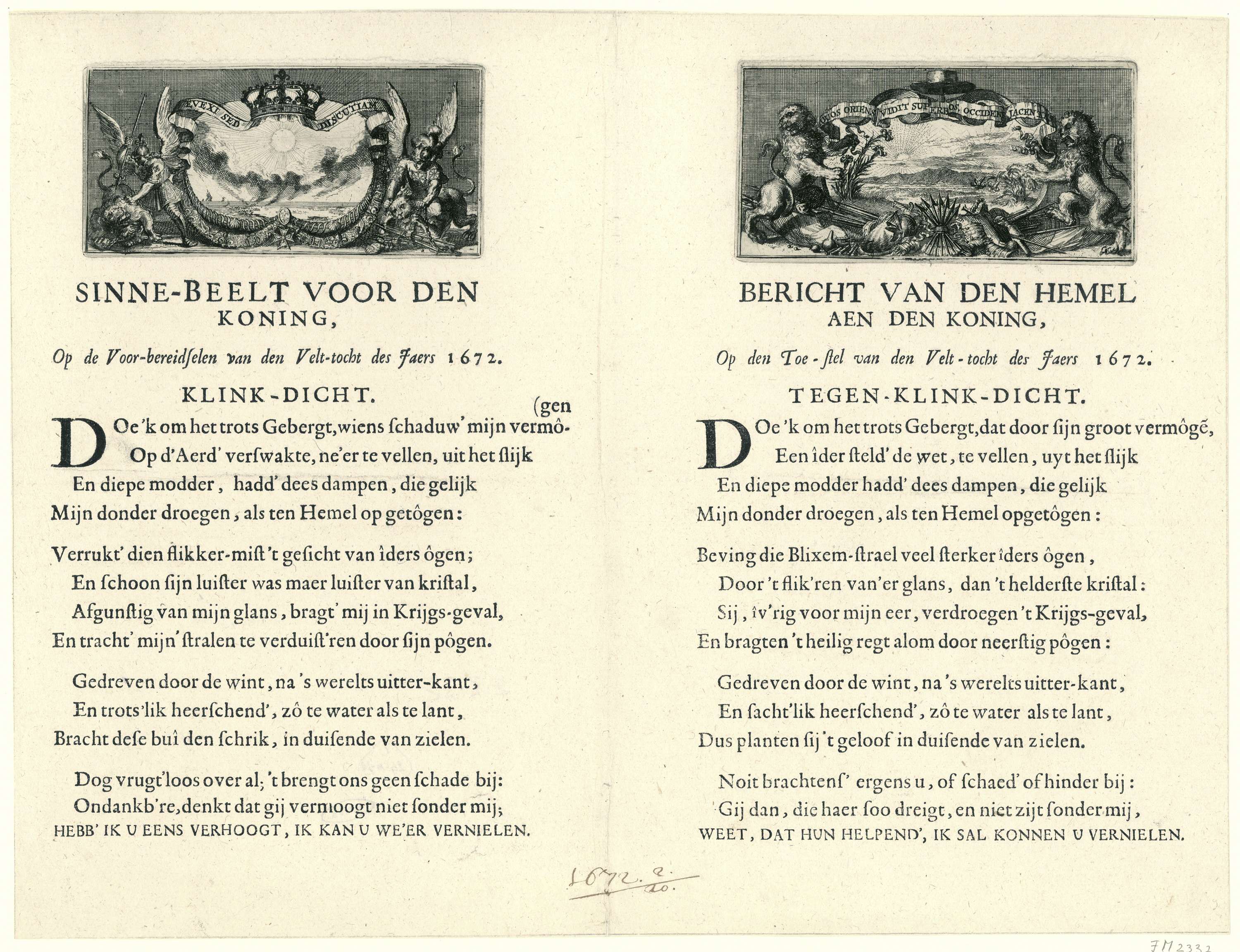 Blad met links een kopie naar het Franse zinnebeeld op de veldtocht van Lodewijk XIV in 1672 met de vergelijking van Lodewijk XIV met de zon en waarin de Nederlandse Leeuw overwonnen wordt. Hieronder een 'Klink-Dicht', de vertaling van het oorspronkelijke Franse vers. Rechts een nieuw Nederlands zinnebeeld vervaardigd in reactie op het Franse met ...