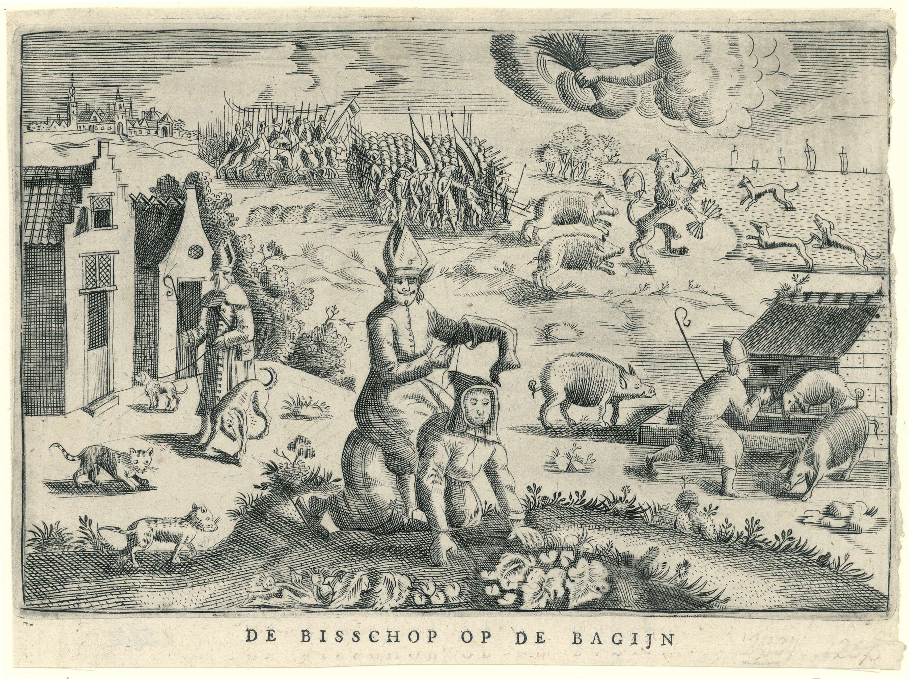Spotprent op Christoph Bernard von Galen, de bisschop van Munster, 1672. Zittend op de rug van een bagijn stopt hij een kous. Links gaat de bisschop met een hond langs huizen, rechts knielt hij als de Verloren Zoon tussen de varkens. Op de achtergrond oprukkende legers, de Hollandse Leeuw tussen de varkens (Munsterse troepen) en ...
