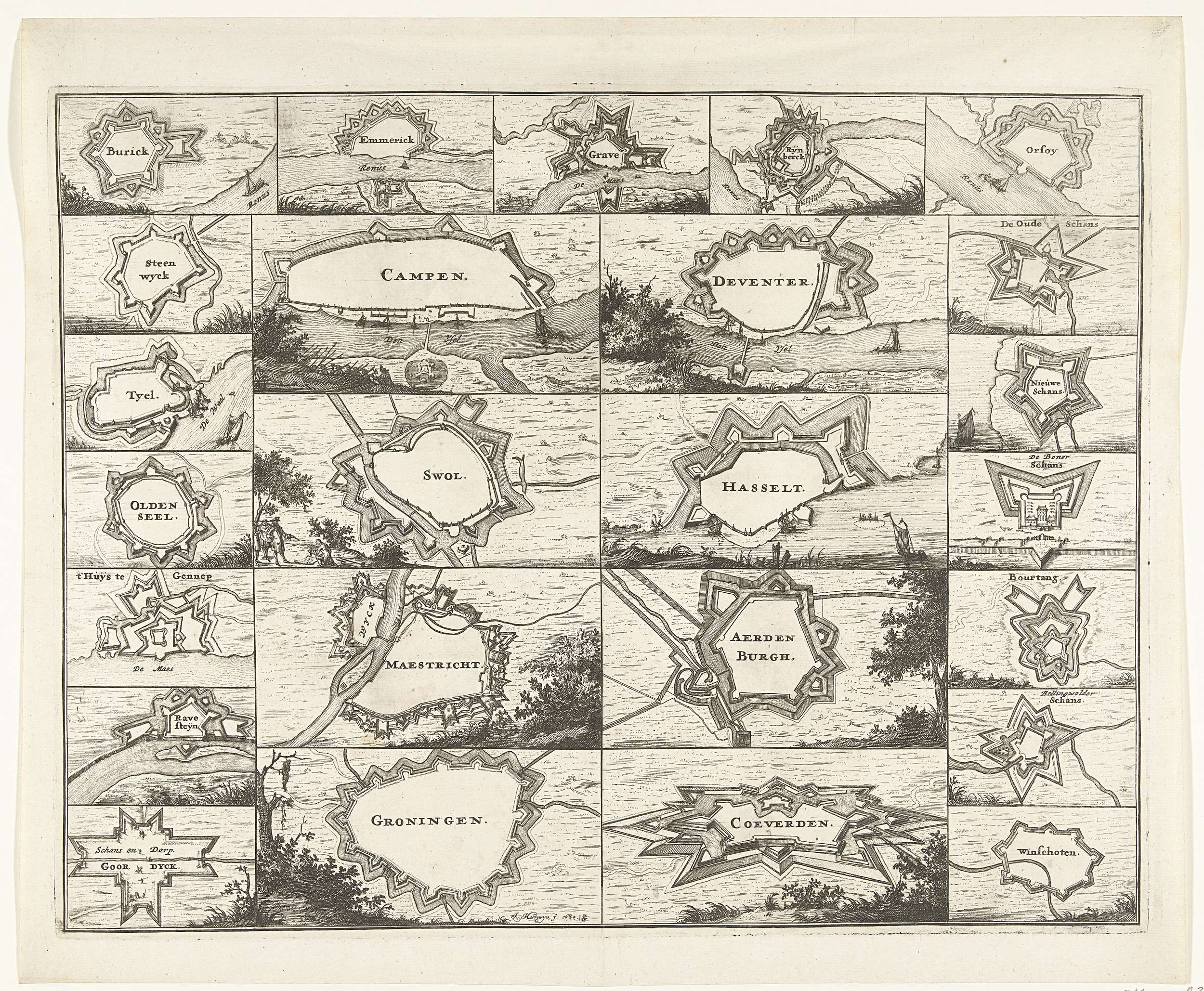 Blad met 8 grote en 17 kleinere plattegronden van de vestingen en versterkte plaatsen door de Fransen veroverd in 1672.
