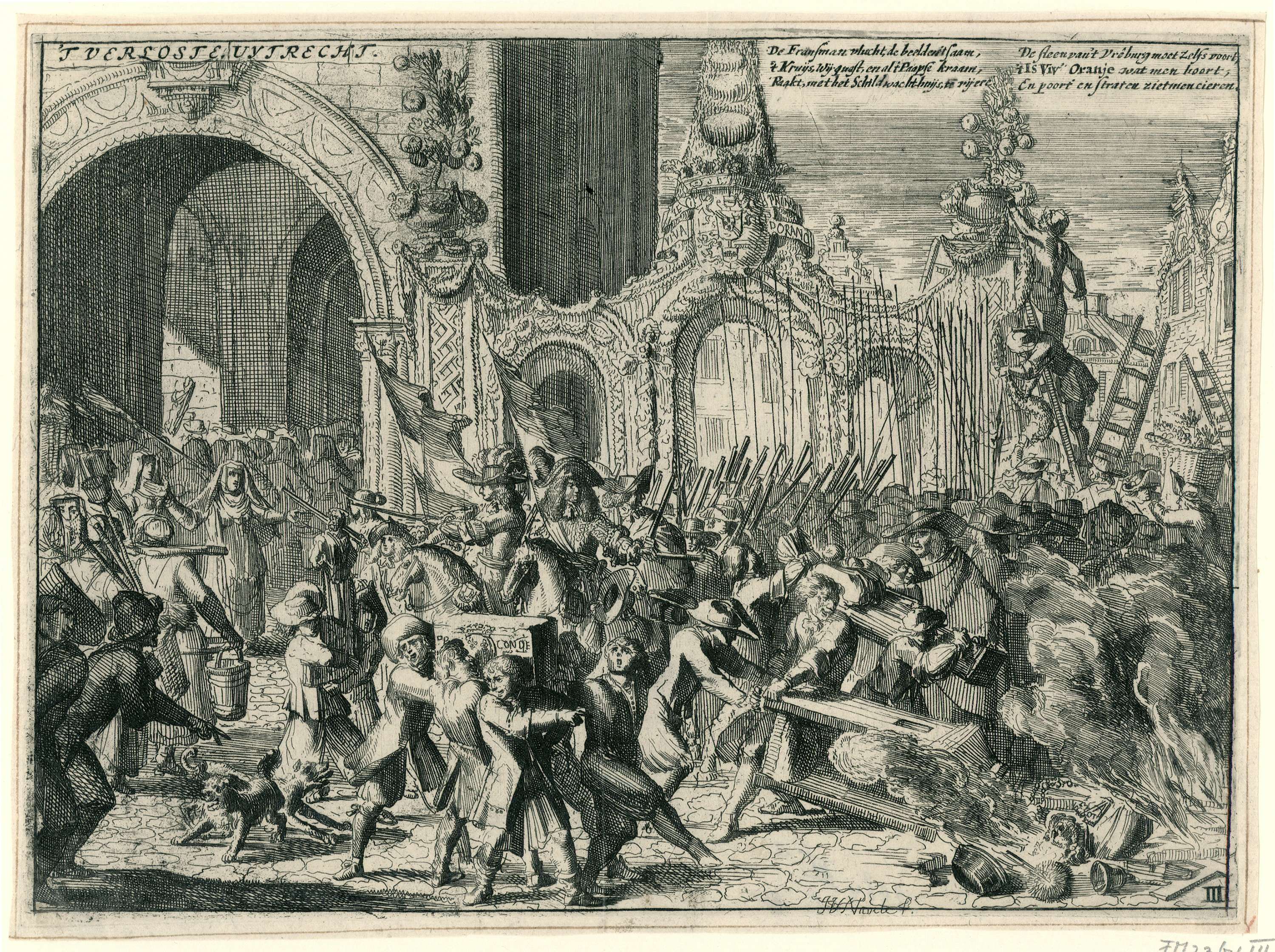 Het vertrek van de Fransen uit Utrecht op 23 november 1673. Op de voorgrond worden alle katholieke attributen die uit de Dom zijn verwijderd verbrand. Links trekken vrouwen met bezems en dweilen de kerk in om deze weer schoon te maken. Op de achtergrond worden triomfbogen voor de prins van Oranje opgericht. Rechtsboven twee drieregelige ...
