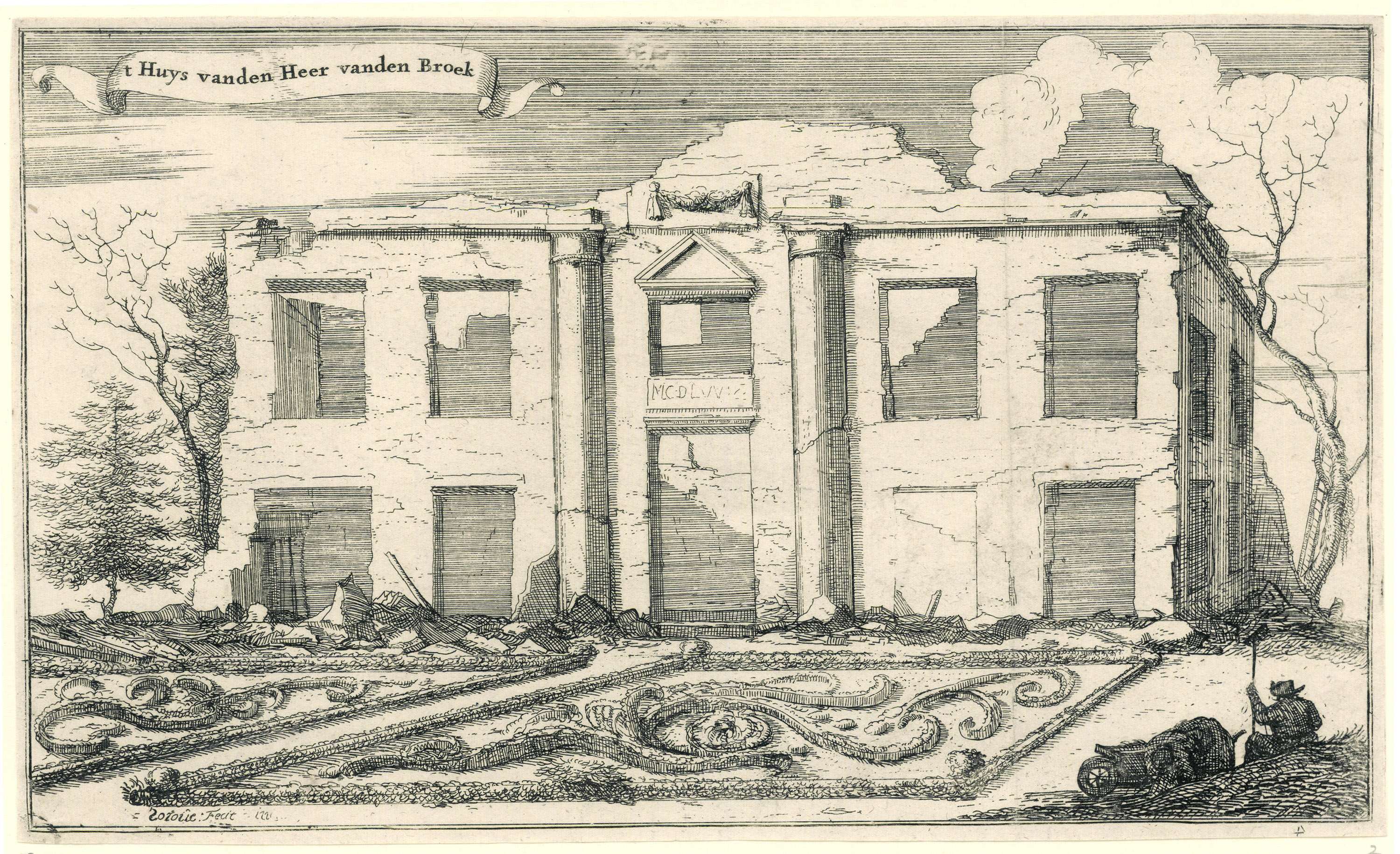 Het verwoeste huis van de Heer vanden Broek. Tweede prent in een reeks van dertien afbeeldingen van de dorpen en kastelen in de provincie Utrecht door de Fransen in 1672 verwoest.