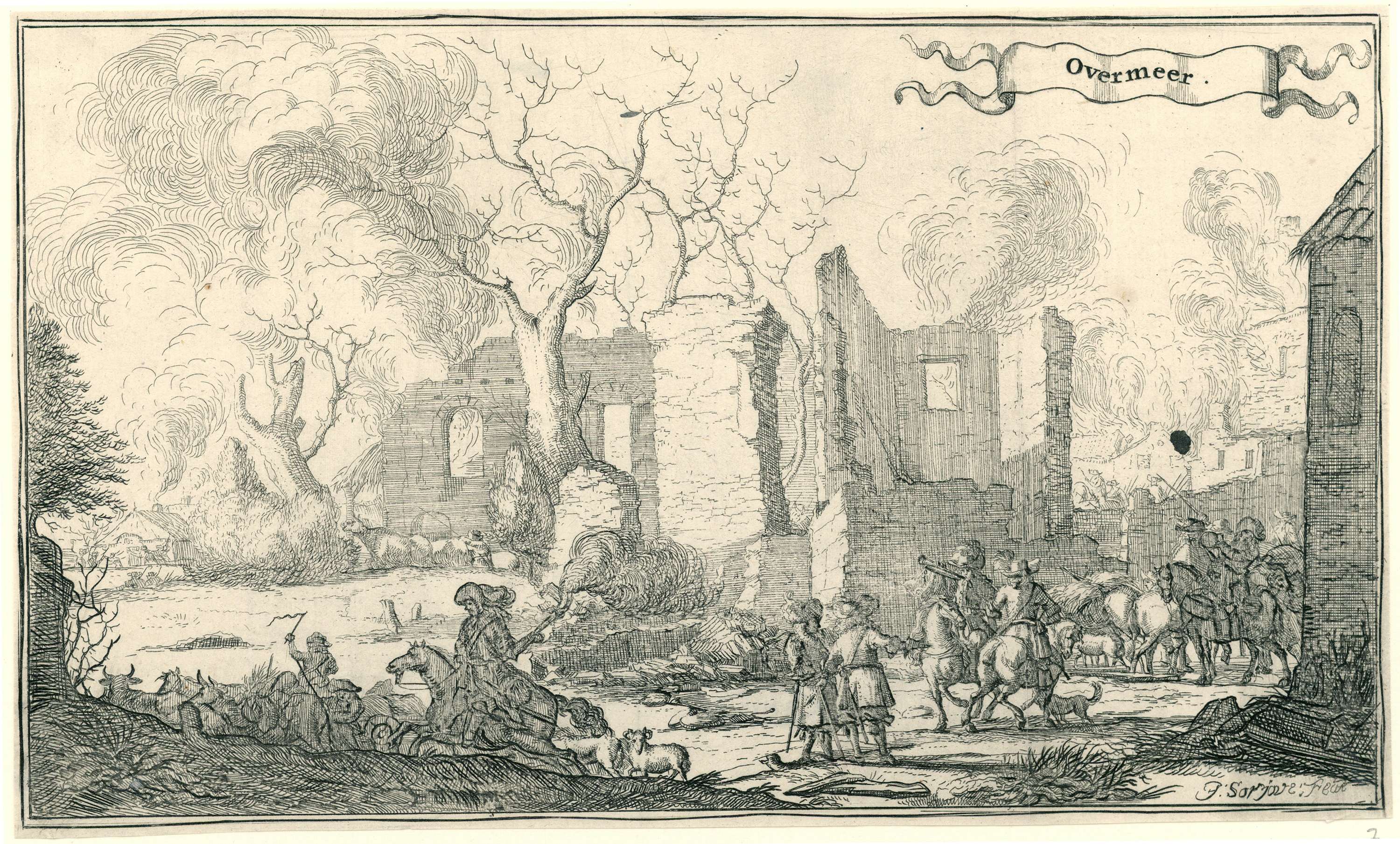 De Fransen tussen de ruïnes van het dorp Overmeer. Zevende prent in een reeks van dertien afbeeldingen van de dorpen en kastelen in de provincie Utrecht door de Fransen in 1672 verwoest.