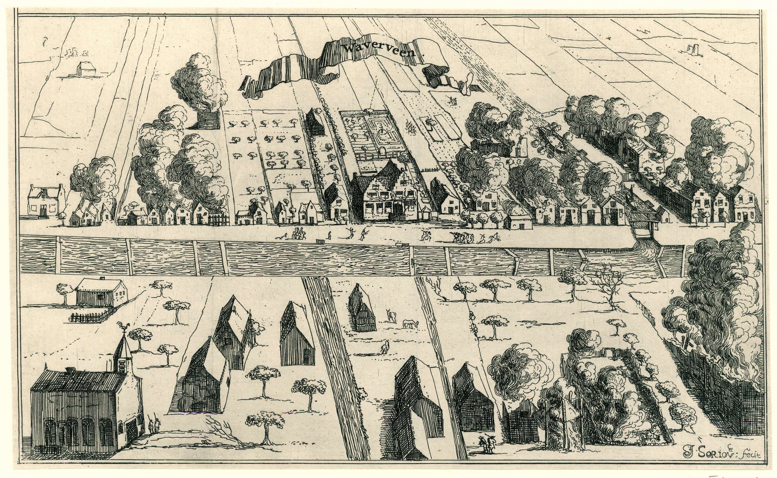 Gezicht op de brandende huizen in het dorpje Waverveen. Dertiende prent in een reeks van dertien afbeeldingen van de dorpen en kastelen in de provincie Utrecht door de Fransen in 1672 verwoest.