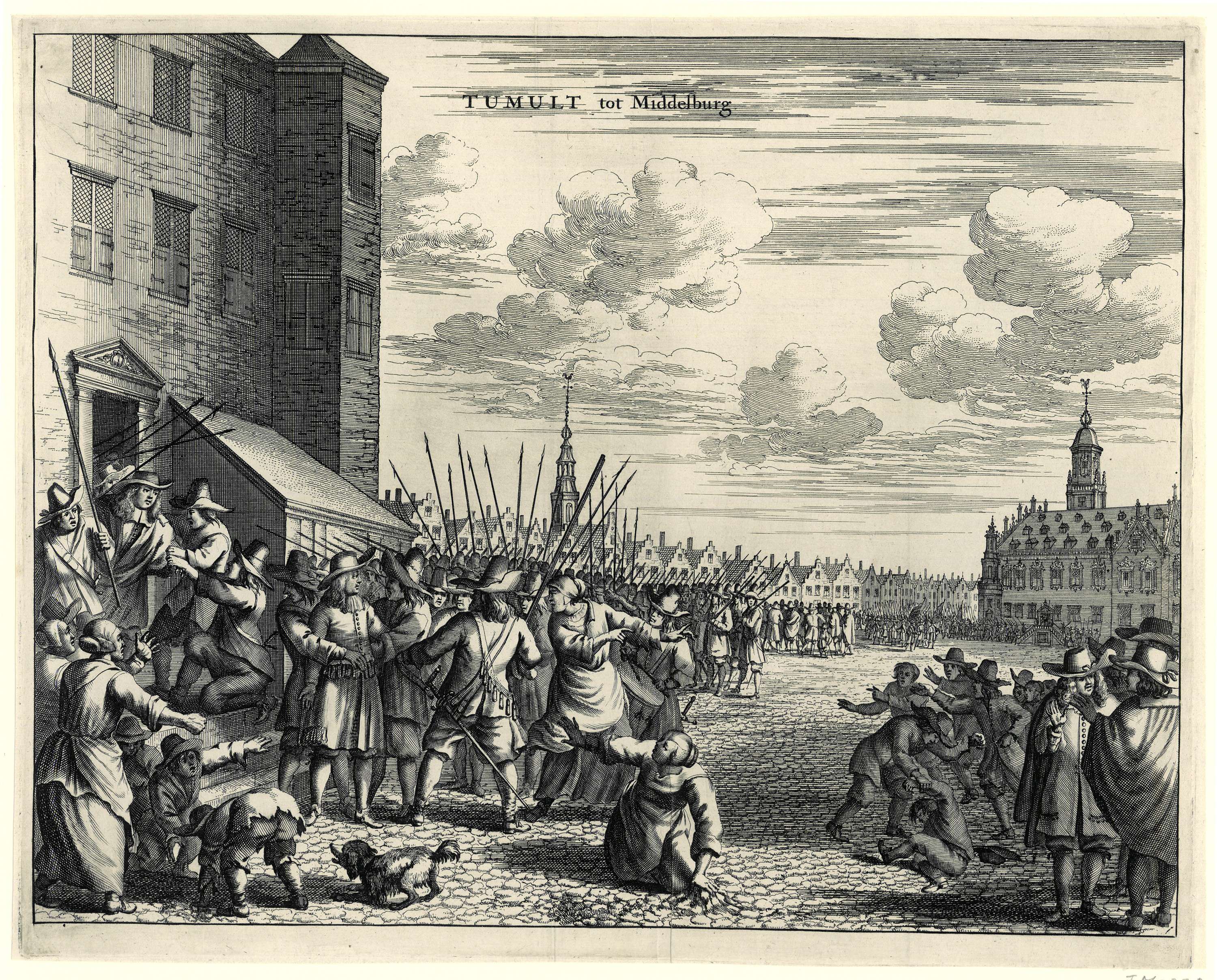 Gezicht op de Grote Markt te Middelburg. Oproerige boeren halen op 21 juli 1672 burgemeester Filips van den Brande en enkele andere regenten uit zijn huis, op verdenking van te heulen met de Fransen.