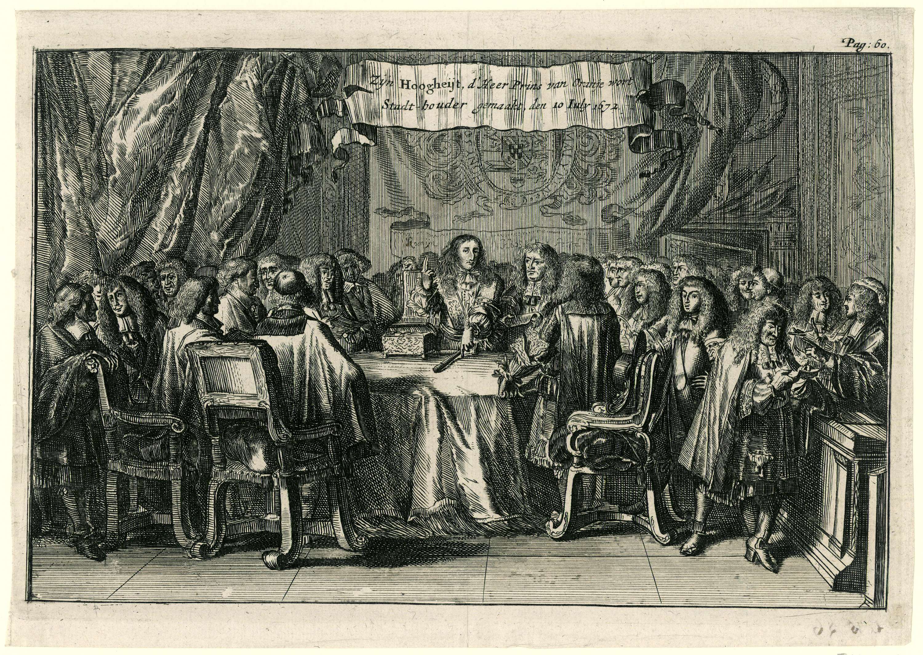 De beëdiging van prins Willem III tot stadhouder van Holland en Zeeland door de Staten-Generaal. Rechtsboven gemerkt: 60.