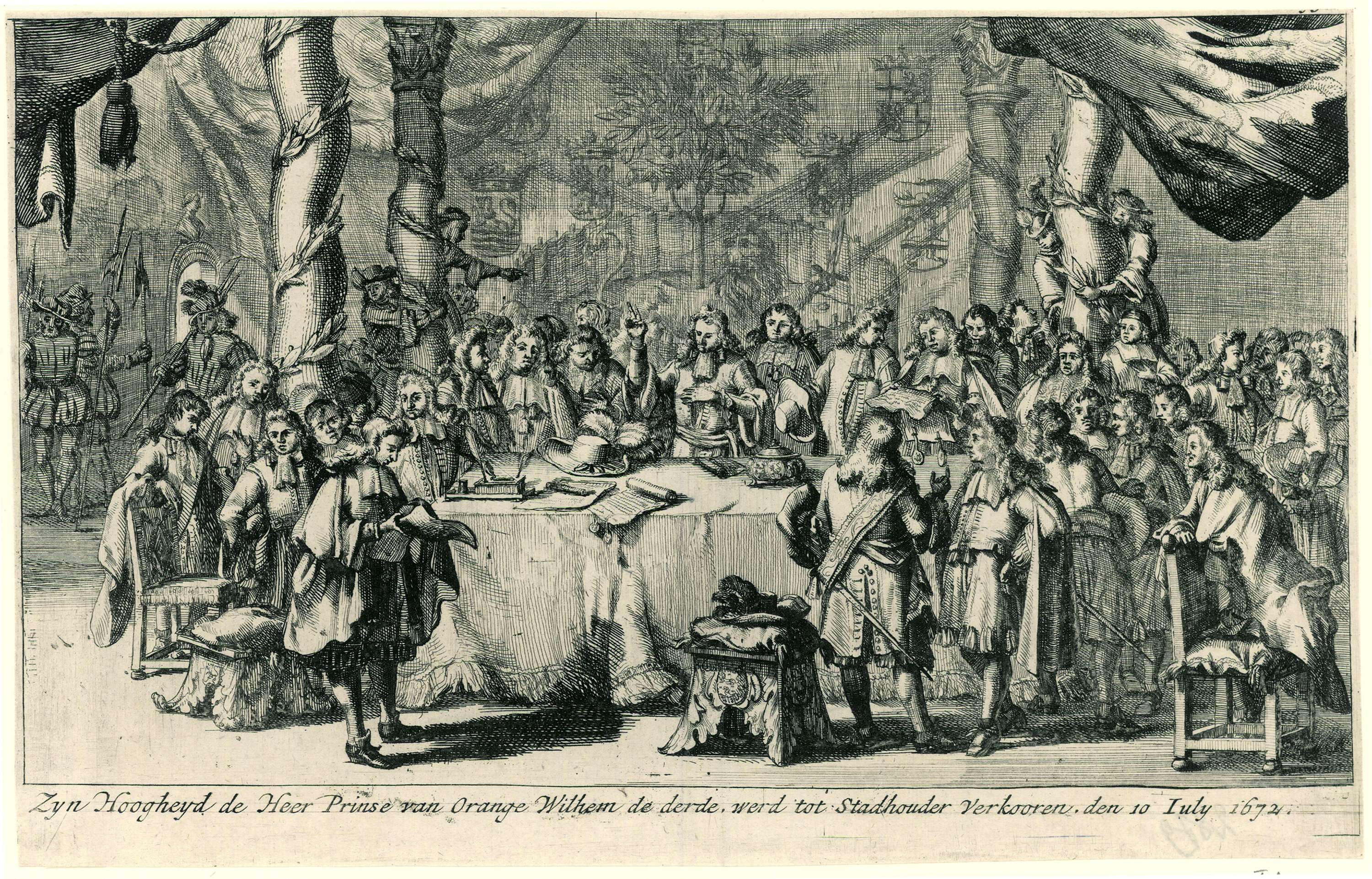 De beëdiging van prins Willem III tot stadhouder van Holland en Zeeland op 10 juli 1672. De plechtigheid vindt plaats voor een wandtapijt met een voorstelling van de Hollandse Tuin met de wapens van de zeven provincies.