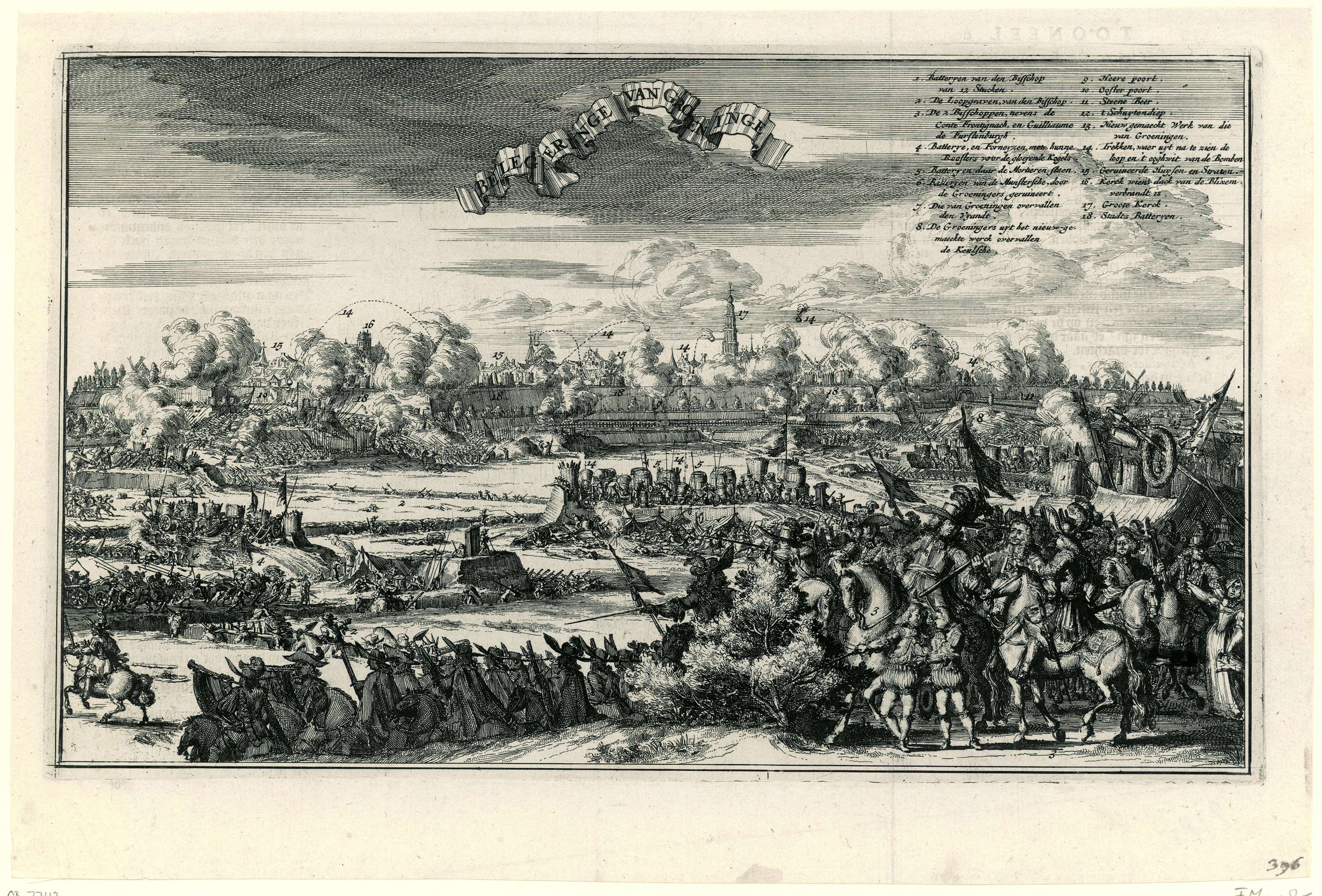 Het beleg van Groningen door de bisschoppen van Keulen en Munster gedurende de maanden juli en augustus van het jaar 1672. De compositie is overgenomen van de prent van Romeyn de Hooghe (FMH 2383). Een nieuw element is de aanwezigheid van de bisschoppen met hun gevolg, rechts op de voorgrond. Details in de voorstelling zijn ...