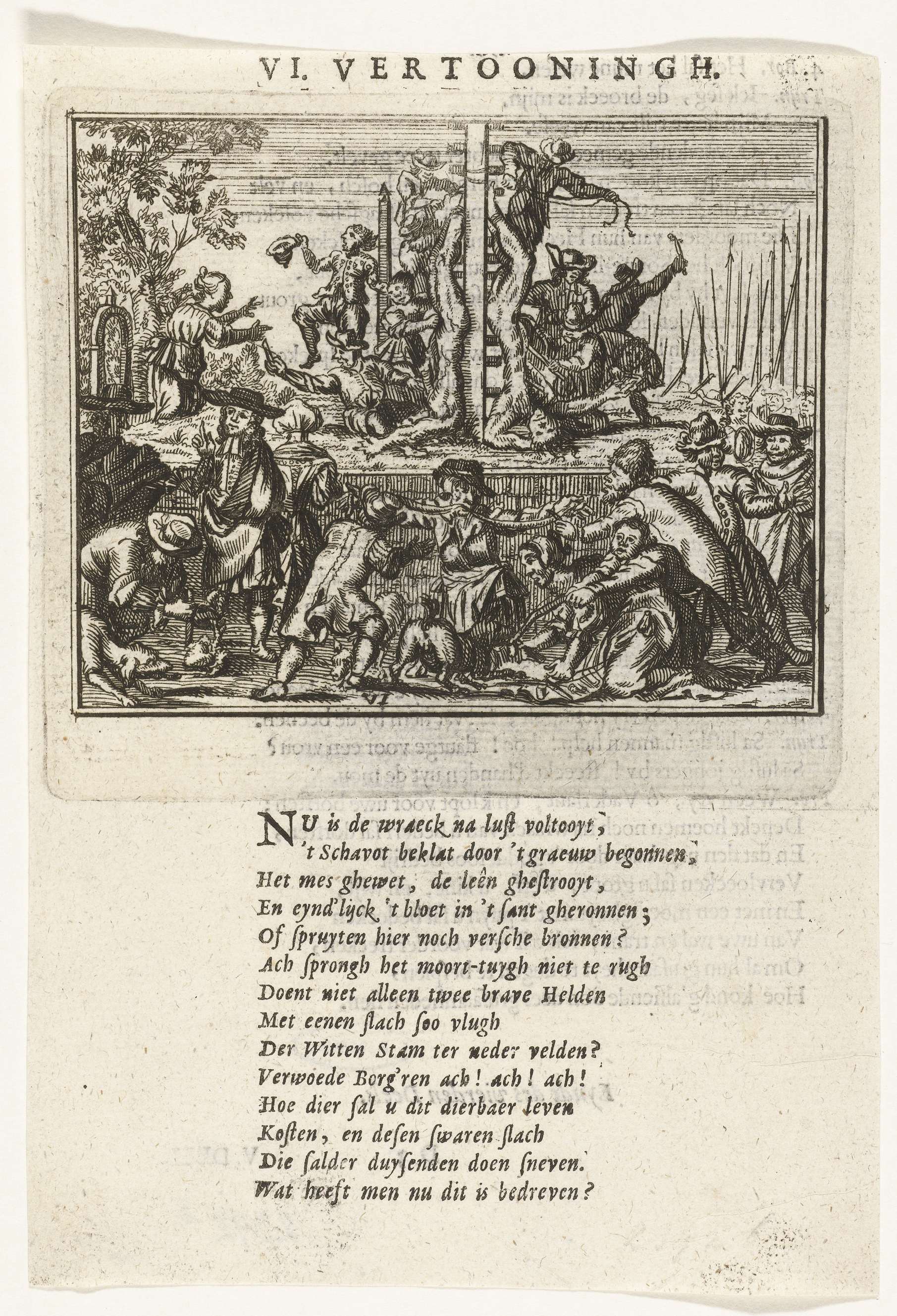 Het verminken van de lichamen van de gebroeders de Witt door de burgers van Den Haag, 20 augustus 1672. Scène uit het leven van Johan en Cornelis de Witt; onderdeel van een groep illustraties, genummerd: VI. Vertooningh en vergezeld van een vers van 8 regels. Bedrukt op achterzijde met tekst in het Nederlands.