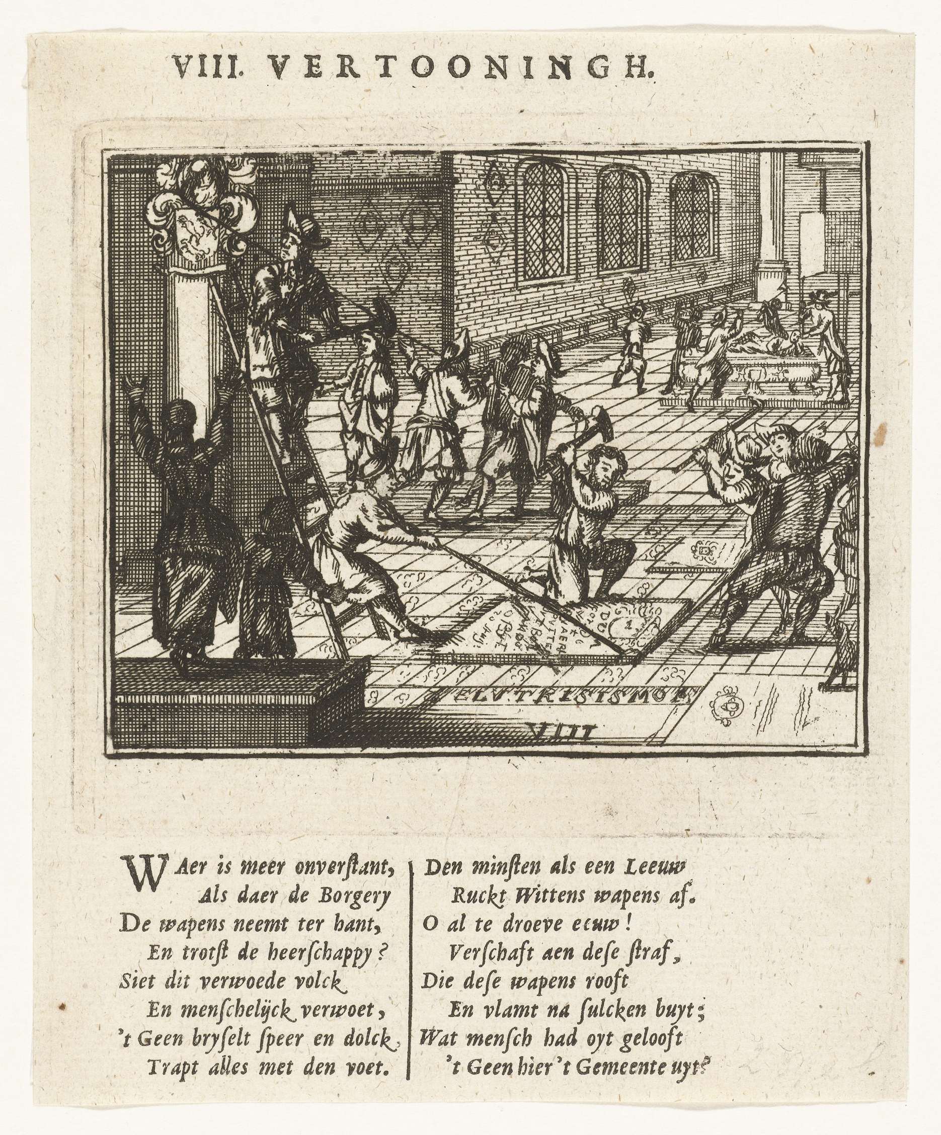De Haagse burgerij vernielt de graven van leden van de familie De Witt in de kerk, 1672. Scène uit het leven van Johan en Cornelis de Witt; onderdeel van een groep illustraties, genummerd: VIII. Vertooningh en vergezeld van een vers van 8 regels. Bedrukt op achterzijde met tekst in het Nederlands.