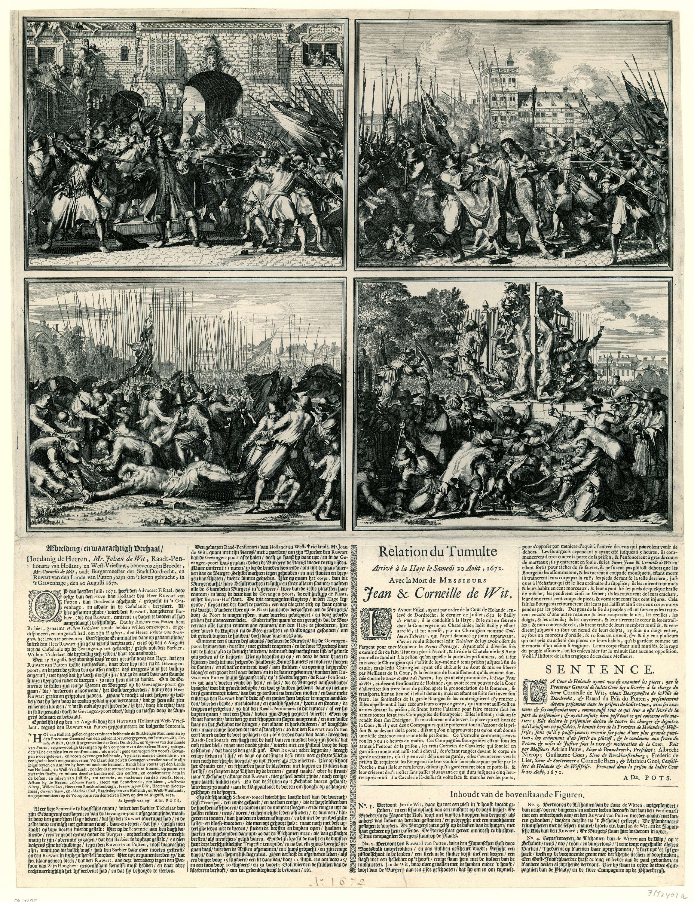 Blad met vier voorstellingen en beschrijvingen van de moord op de gebroeders De Witt te Den Haag op 20 augustus 1672. Boven de gevangenneming en de moorden, onder worden de lichamen naar het schavot gesleept en verminkt. Onder de voorstellingen beschrijvingen van de gebeurtenissen in het Nederlands en Frans en een uitleg over de afbeeldingen.