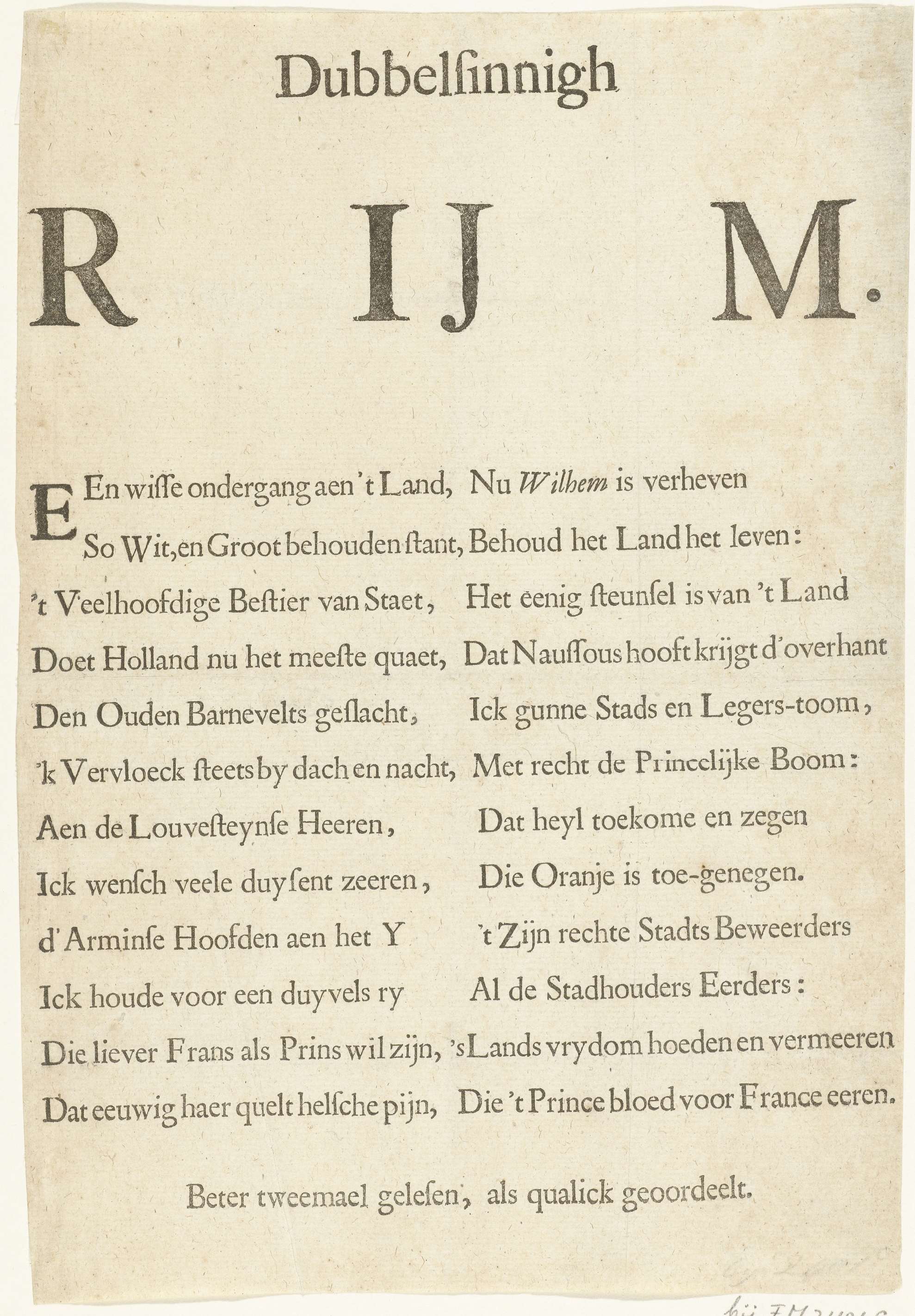 Vers op de dood van de gebroeders De Witt, 20 augutsus 1672. Vers in twee kolommen waarbij het anti-Orangistische sentiment pas blijkt in het lezen van de tweede kolom.