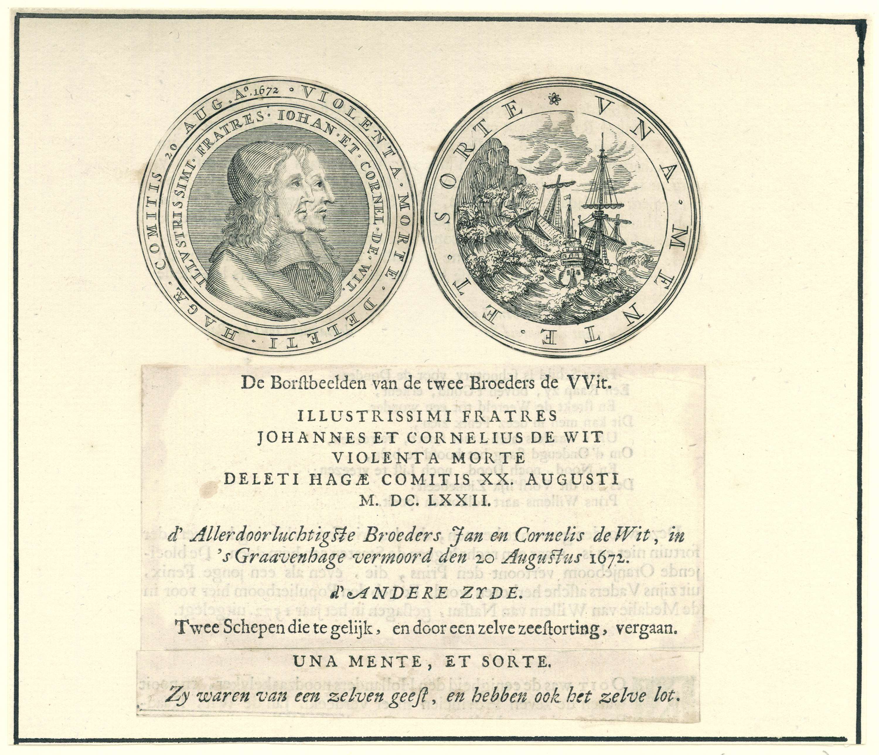 Blad met de voor- en achterzijde van een penning vervaardigd ter nagedachtenis aan Johan en Cornelis de Witt, gedood in 1672. De voorzijde toont de portretten van de gebroeders en profil. Op de keerzijde twee schepen die in een storm vergaan. Op hetzelfde blad is een uitgeknipte beschrijving van de penning geplakt.