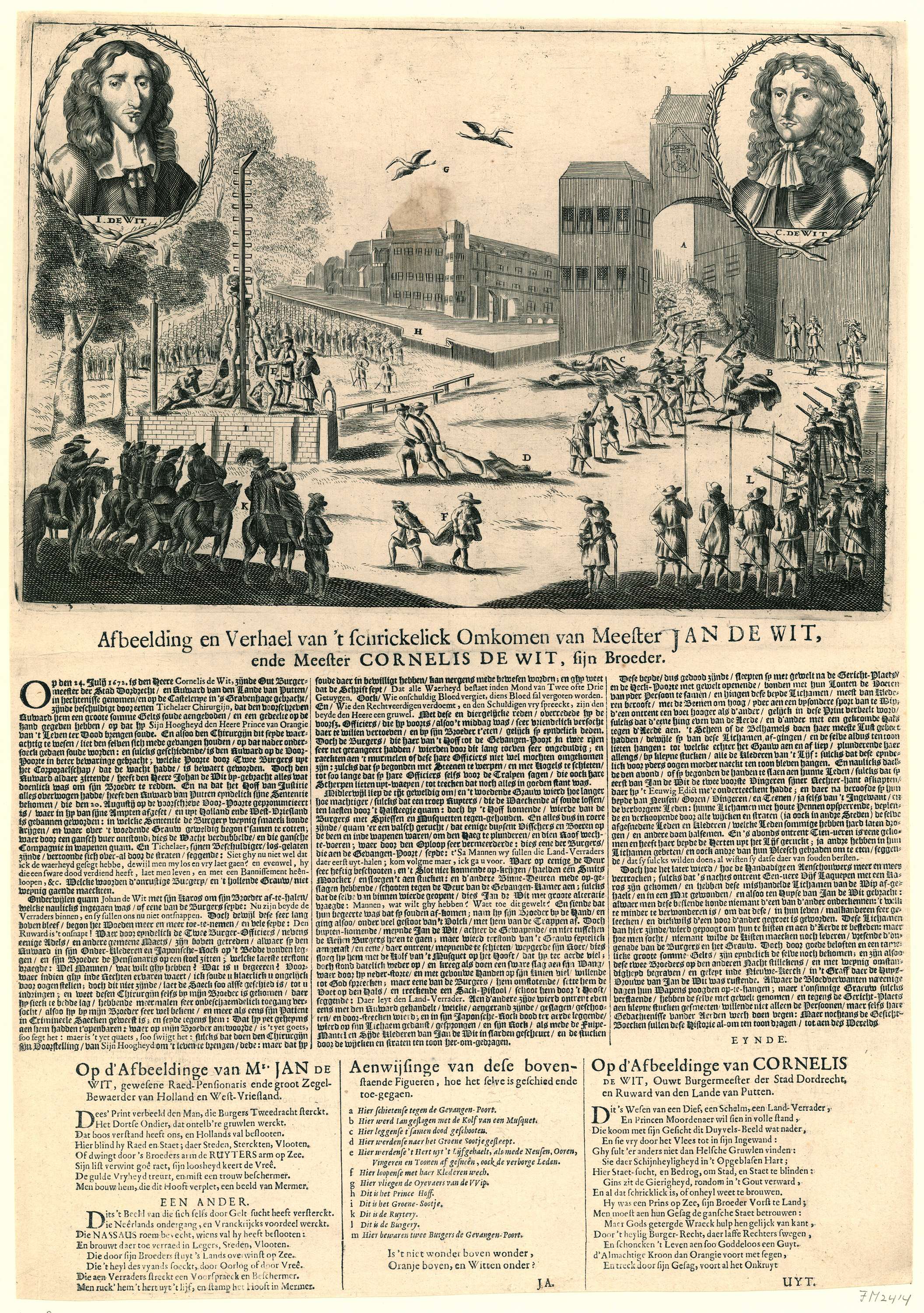 Voorstelling van de gebeurtenissen rond de moord op de gebroeders Johan en Cornelis de Witt. Bovenin de voorstelling zijn de portretten van Johan en Cornelis de Witt opgenomen. Details in de voorstelling zijn met letters aangeduid die in de Aenwijsinge beneden worden verklaard. Onder de voorstelling een beschrijving van de gebeurtenissen over drie kolommen. Daaronder, ...