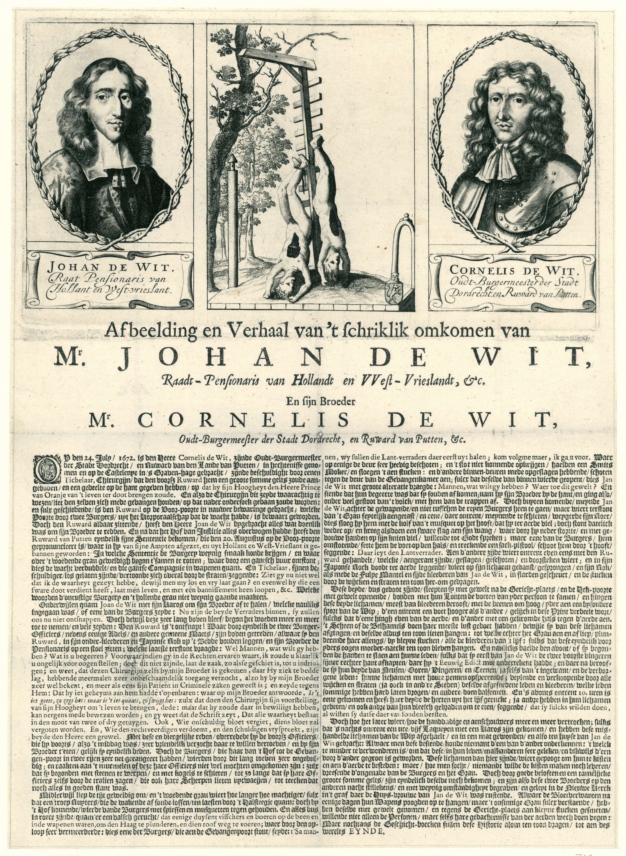Blad over de moord op de gebroeders Johan en Cornelis de Witt op 20 augustus 1672. Bovenaan portretten van Johan en Cornelis de Witt aan weerszijden van een voorstelling van de verminkte lichamen hangend aan de galg. Hieronder een beschrijving van de gebeurtenissen over twee kolommen.