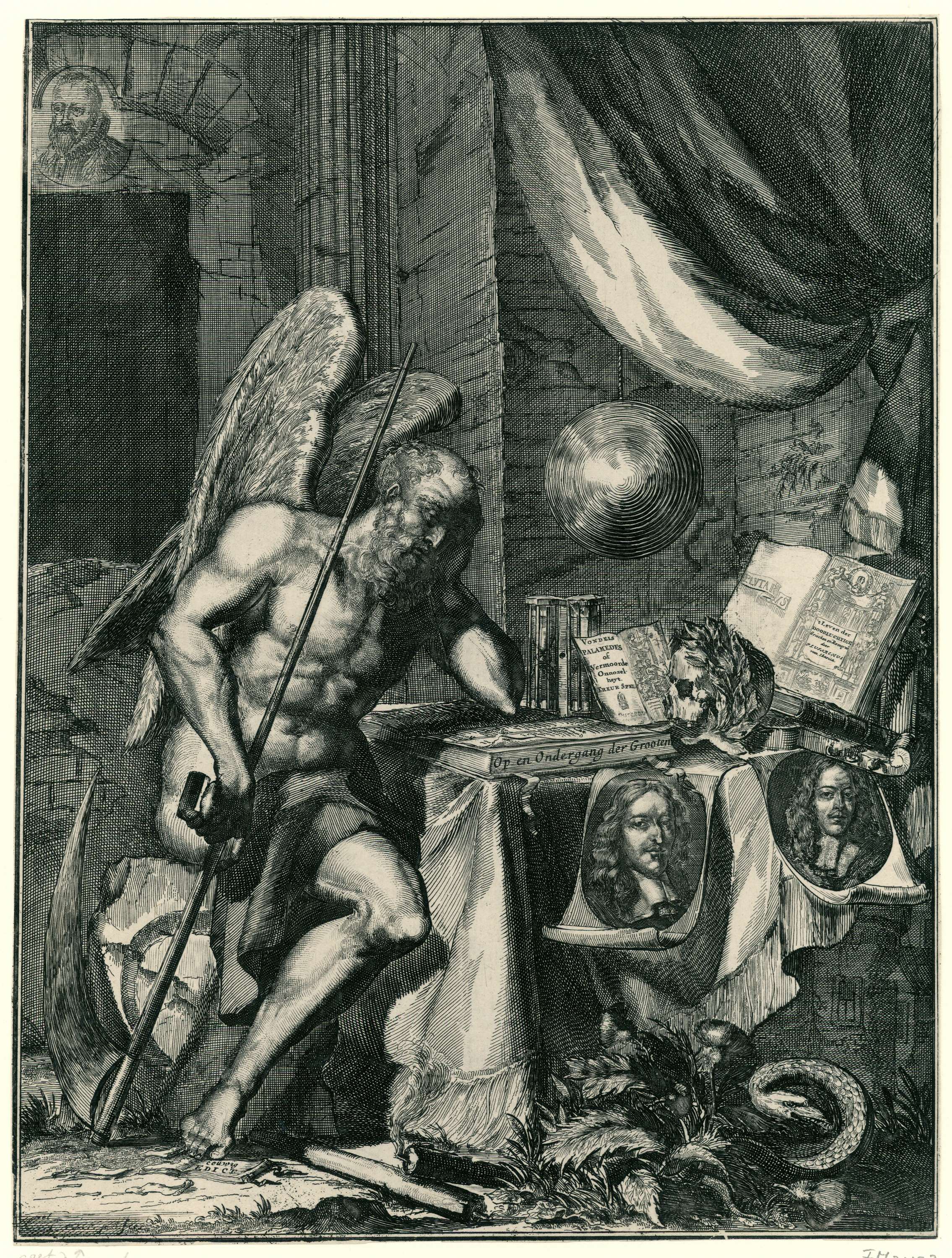 Zinneprent op de dood van de gebroeders De Witt. De voorstelling toont Vader Tijd peinzend aan een tafel waarop een zandloper staat en een schedel met een lauwerkrans, de portretten van Johan en Cornelis de Witt en enkele opengeslagen boeken liggen. De boeken zijn Vondels 'Palamedes of Vermoorde Onnozelheyt' en 't Leven der Doorluchtige Griecken ...