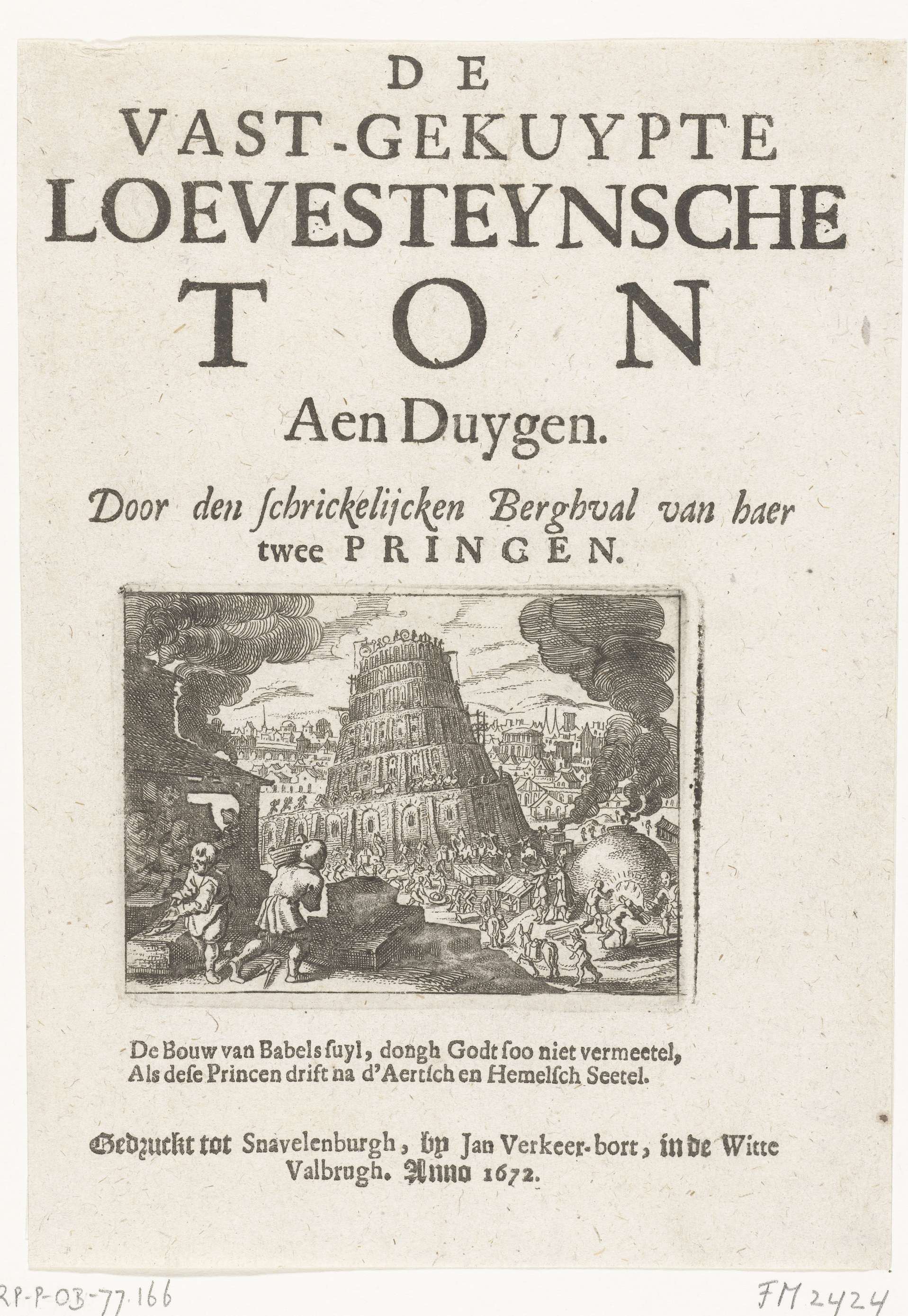 Titelpagina voor het pamflet: De vast-gekuypte Loevesteynsche ton aen duygen. Door den schrickelijcken Berghval van haer twee Princen, 1672. De toren van Babel als zinnebeeld van de overmoed en val van de gebroeders Johan en Cornelis de Witt, 20 augustus 1672.