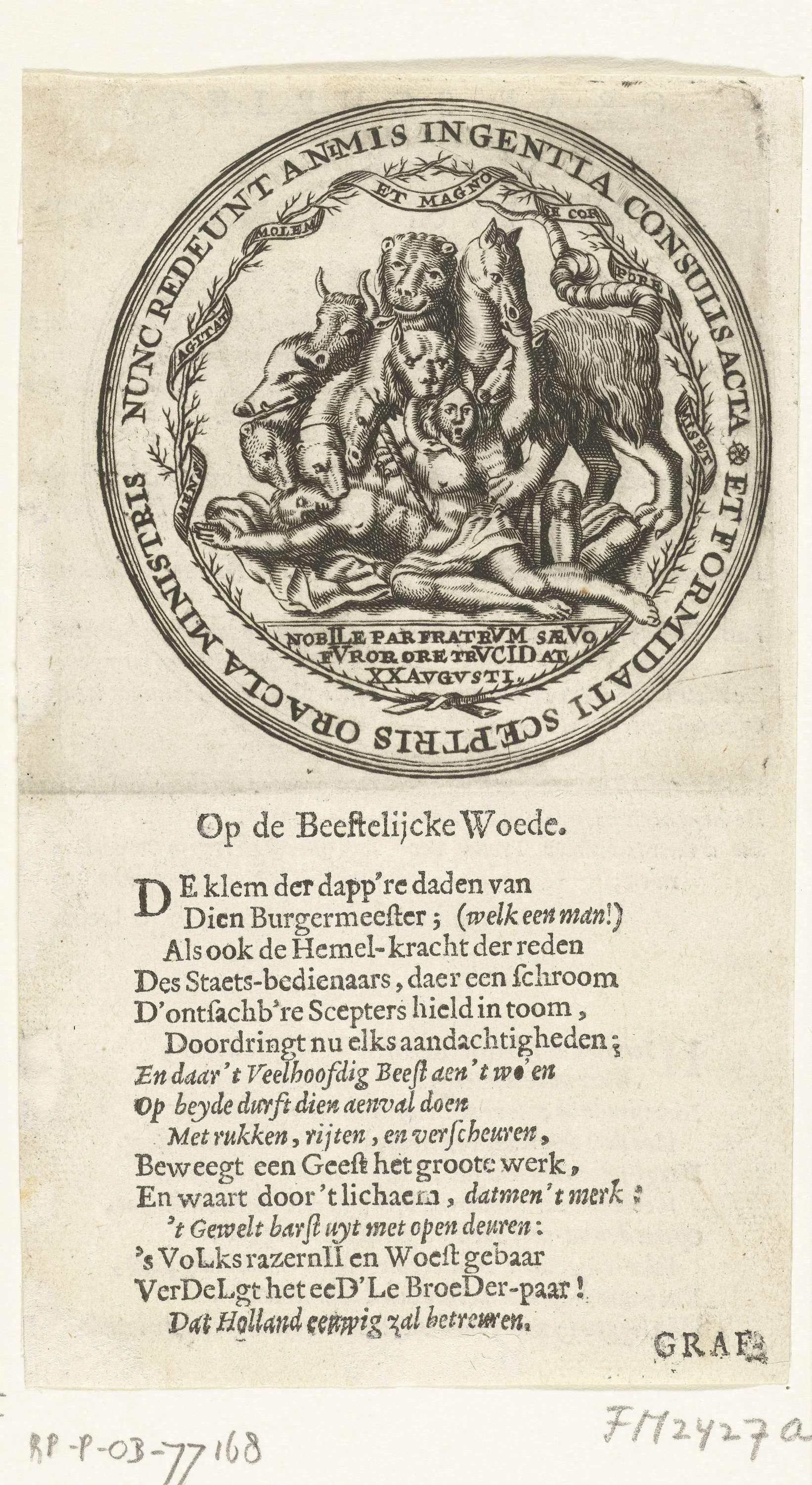 Keerzijde van een penning met een allegorische voorstelling van de dood van de gebroeders Johan en Cornelis de Witt, vermoord op 20 augustus 1672, waarin de broers aangevallen door een beest met vele koppen, symbool van het volk dat de lichamen verminkte. Onder de penning een vers getiteld: Op de Beestelijcke Woede. Bedrukt op achterzijde ...