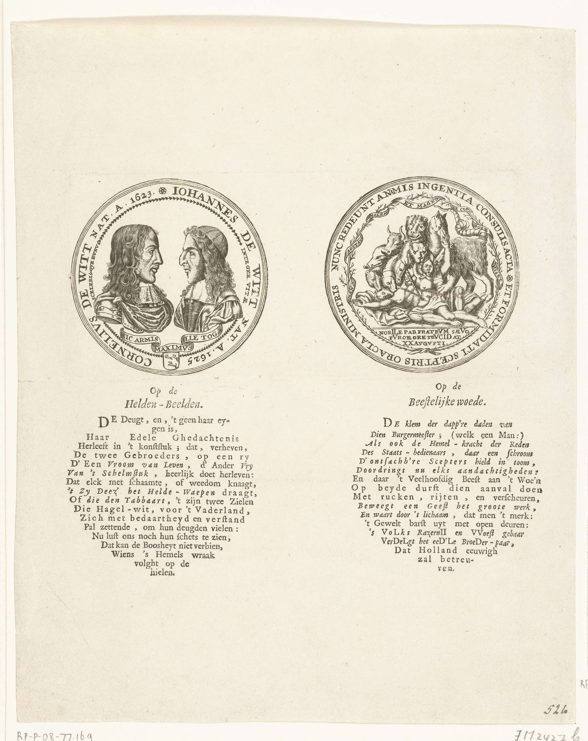 Voor- en keerzijde van een penning met de portretten van de gebroeders Johan en Cornelis de Witt, en een allegorische voorstelling van de dood van de gebroeders Johan en Cornelis de Witt, vermoord op 20 augustus 1672, waarin de broers worden aangevallen door een beest met vele koppen, symbool van het volk dat de lichamen ...