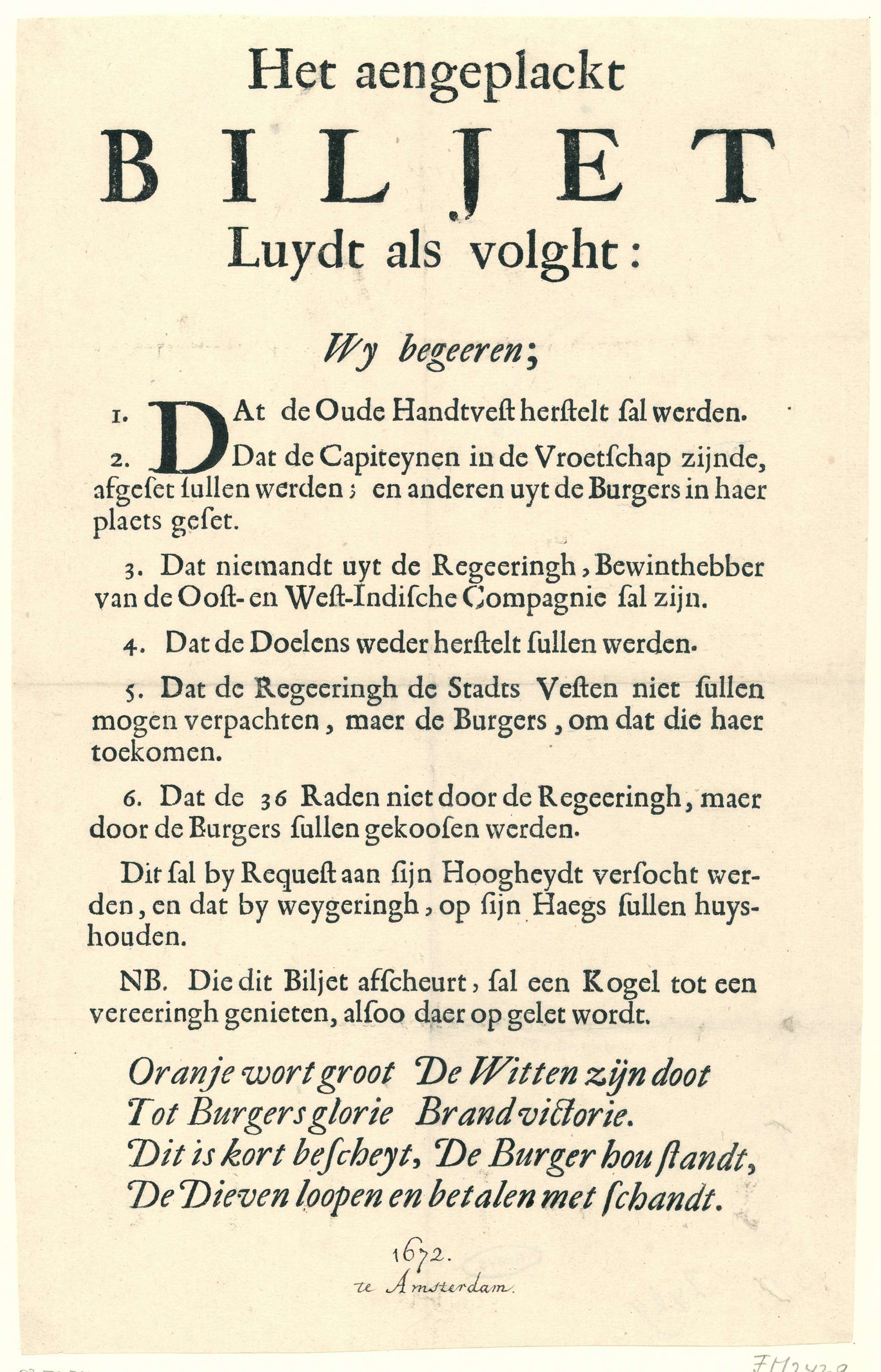 Oranjegezind aanplakbiljet waarin zes eisen worden geformuleerd met betrekking tot gewenste veranderingen in de regering. Onder de eisen staat een vers waarin de prins van Oranje wordt geëerd en de dood van de gebroeders De Witt wordt gevierd. Onderaan het blad is met de hand geschreven '1672. te Amsterdam'. Muller vermeldt dat het blad volgens ...