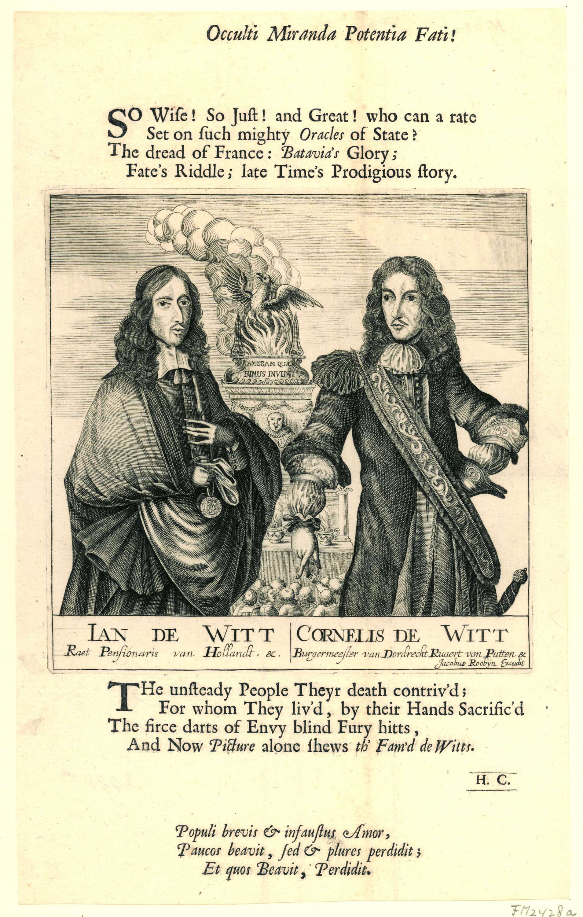 Engels blad met voorstelling van en verzen over Johan en Cornelis de Witt. De voorstelling toont de broers staande voor een altaar waar een fenix uit de vlammen verrijst. Deze gravure heeft Nederlandse onderschriften en draagt het adres van Jacobus Robijn. Boven en onder de voorstelling staat een Engels vers van acht regels gesigneerd met ...