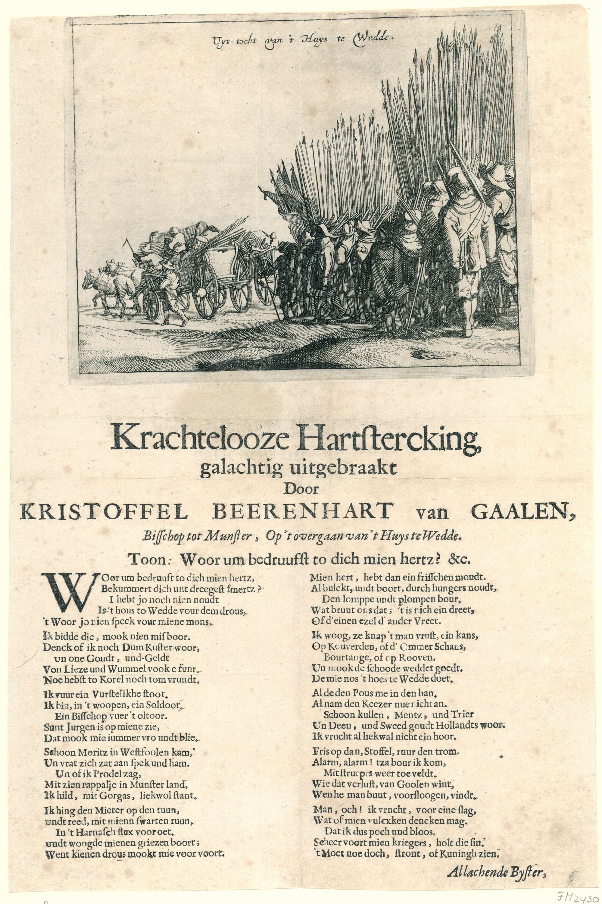 Blad met een voorstelling van de troepen van de bisschop van Munster die vertrekken uit het Huis-te-Wedde in Groningen. Dit slot werd door de troepen ingenomen toen zij vanuit Duitsland optrokken naar de stad Groningen, september 1672. Na het mislukken van het beleg in augustus verlieten de legers het gebied. In september trokken ze weg ...