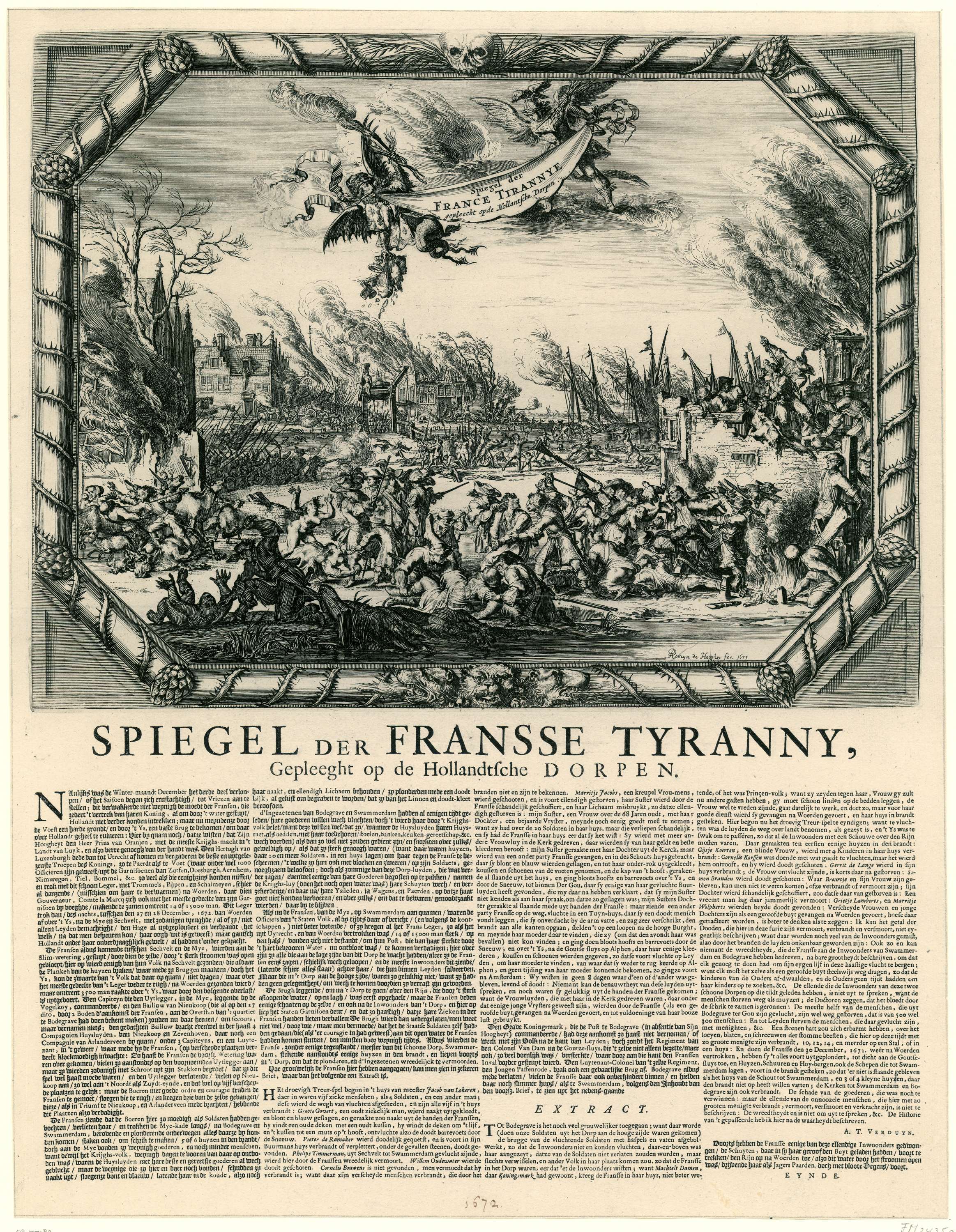 Voorstelling van de wreedheden gepleegd door de Franse troepen in de Hollandse dorpen Bodegraven en Zwammerdam, eind december 1672. Het opschrift wordt in de lucht gedragen door personificaties van de oorlog en de Franse wreedheid. Links het brandende dorp Zwammerdam met de ophaalbrug. Op de voorgrond verkrachtingen, martelingen en moordpartijen. De voorstelling is gevat in ...