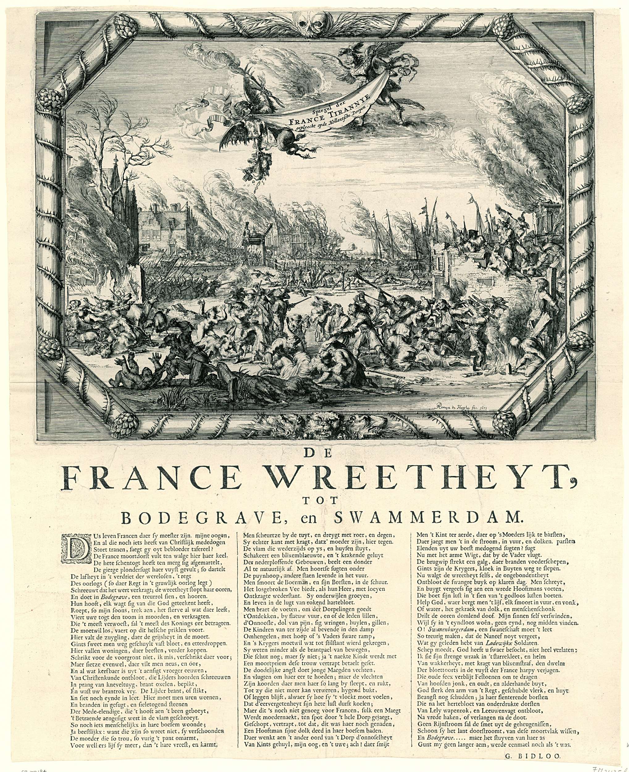 Voorstelling van de wreedheden gepleegd door de Franse troepen in de Hollandse dorpen Bodegraven en Zwammerdam, eind december 1672. Het opschrift wordt in de lucht gedragen door personificaties van de oorlog en de Franse wreedheid. Links het brandende dorp Zwammerdam met de ophaalbrug. Op de voorgrond verkrachtingen, martelingen en moordpartijen. De voorstelling is gevat in ...