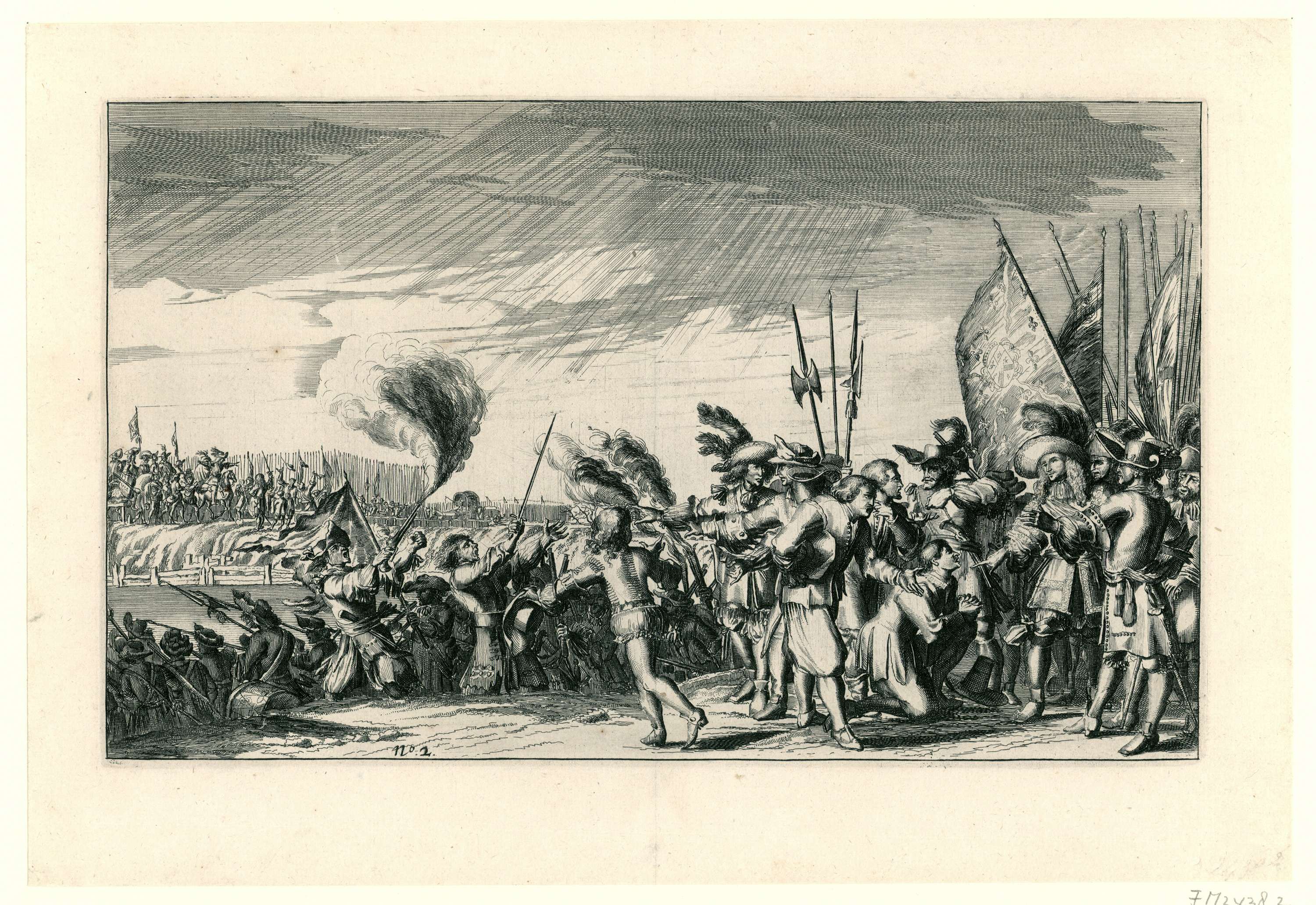 Voorstelling van de wreedheden bedreven door de Franse troepen in Hollandse dorpen in het jaar 1672, gekopieerd naar de prenten van Romeyn de Hooghe uit 1673 (FMH 2439). In de voorstelling knielen, buiten de stad, verschillende personen voor een Franse veldheer en zijn officieren. De prent is genummerd: 2.