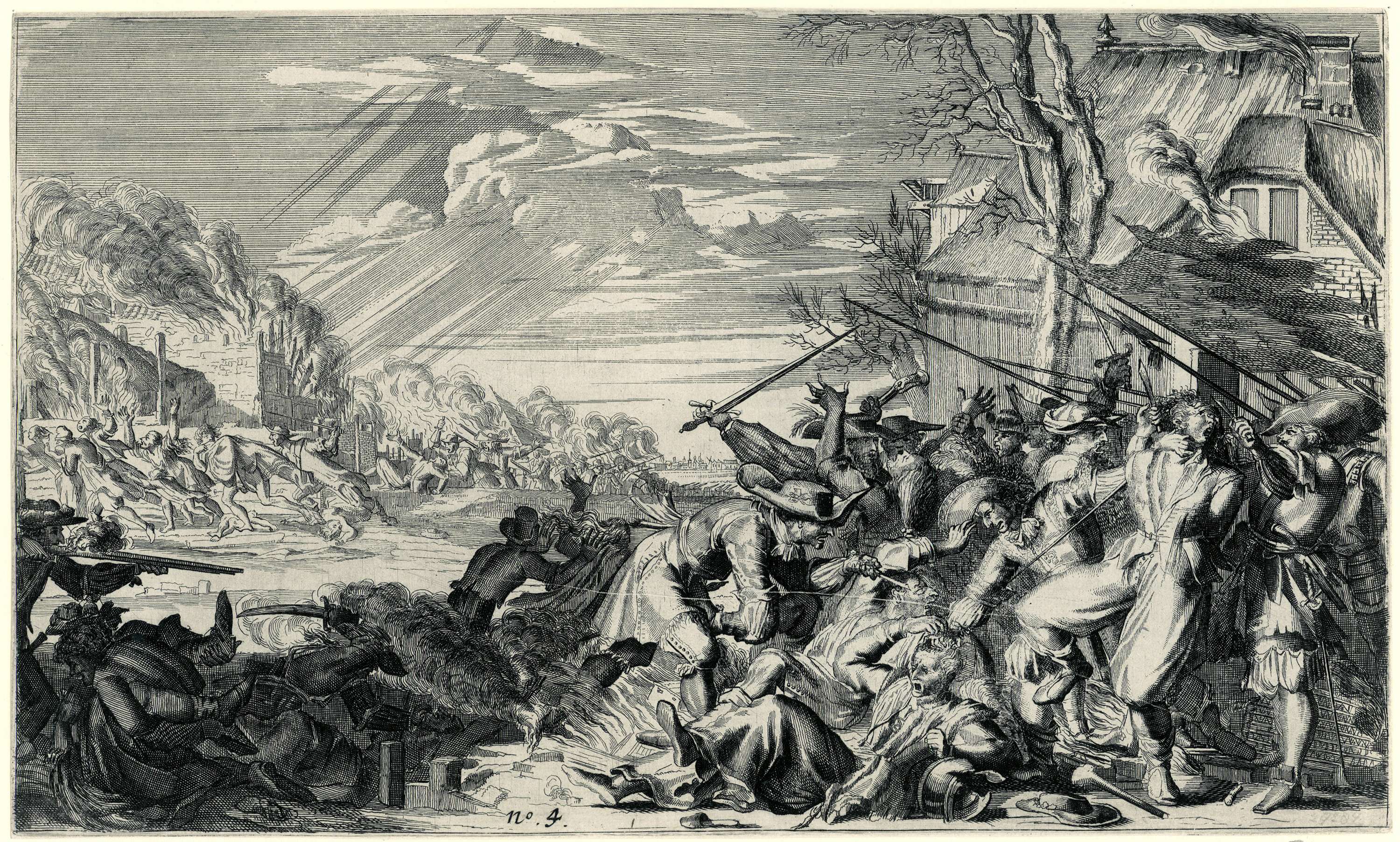 Voorstelling van de wreedheden bedreven door de Franse troepen in Hollandse dorpen in het jaar 1672, gekopieerd naar de prenten van Romeyn de Hooghe uit 1673 (FMH 2439). De voorstelling toont het vermoorden, verminken en verkrachten van de bewoners. Links vluchten bewoners uit het brandende dorp. Rechts gevechten voor een woning. De prent is genummerd: ...