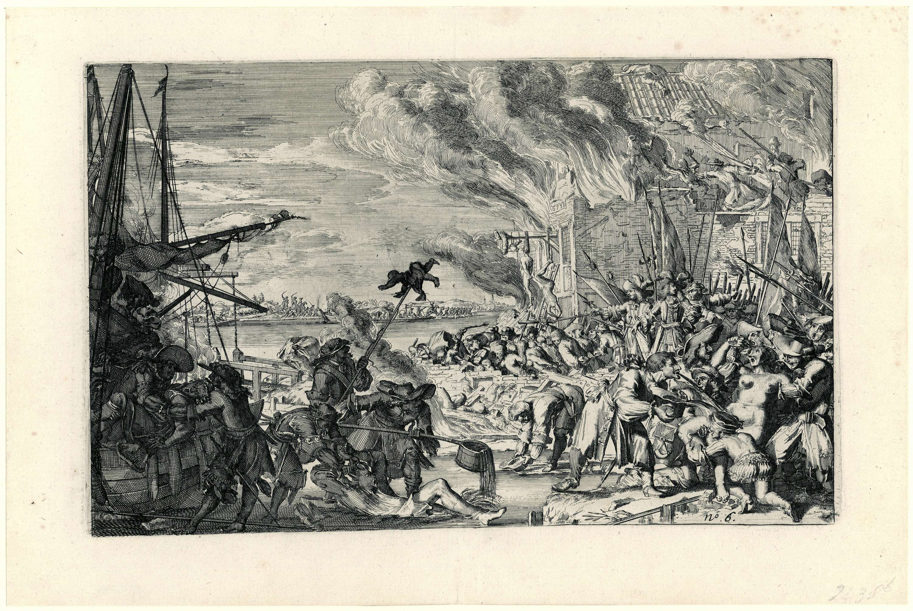Voorstelling van de wreedheden bedreven door de Franse troepen in Hollandse dorpen in het jaar 1672, gekopieerd naar de prenten van Romeyn de Hooghe uit 1673 (FMH 2439). De voorstelling toont het vermoorden van de bewoners van een dorp aan het water. Rechts brandende huizen en een verkrachting, links enkele boten. In het midden een ...