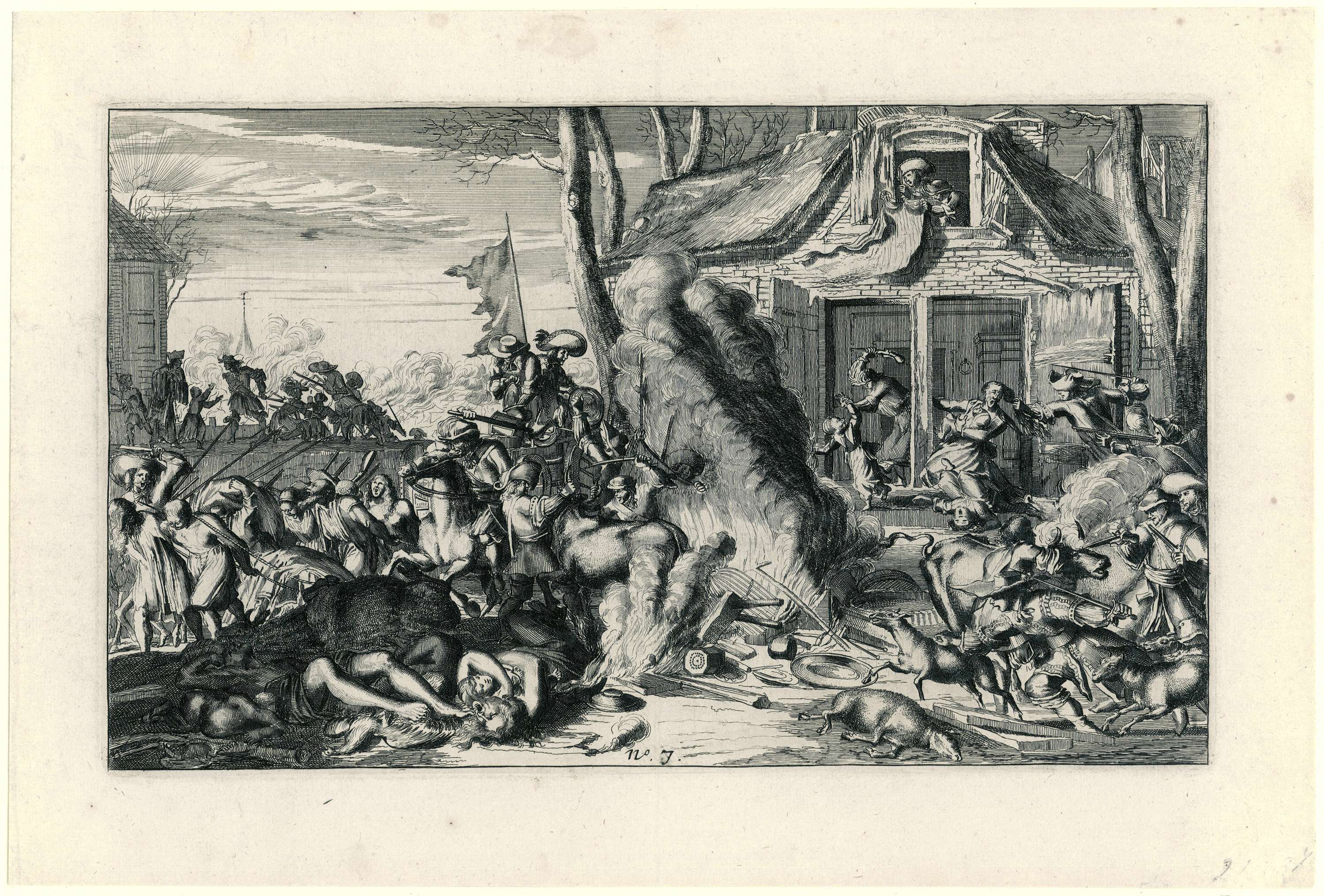 Voorstelling van de wreedheden bedreven door de Franse troepen in Hollandse dorpen in het jaar 1672, gekopieerd naar de prenten van Romeyn de Hooghe uit 1673 (FMH 2439). In het midden van de voorstelling wordt huisraad verbrand. Rechts wordt het vee gedood, links worden bewoners gedwongen een wagen te trekken. De prent is genummerd: 7.