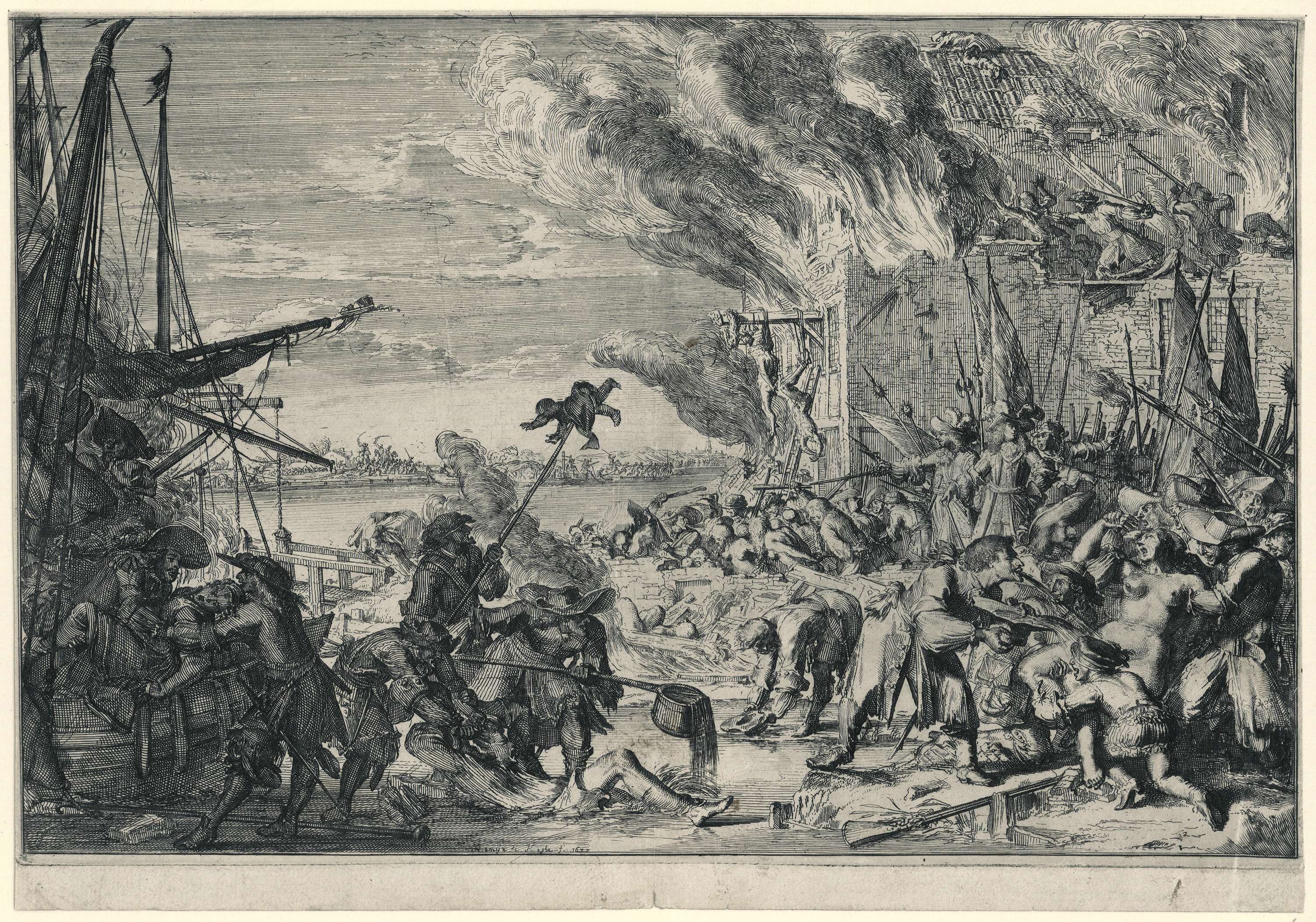 Voorstelling van de wreedheden bedreven door de Franse troepen in Hollandse dorpen in het jaar 1672. De voorstelling toont het vermoorden van de bewoners van een dorp aan het water. Rechts brandende huizen en een verkrachting, links enkele boten. In het midden een Franse soldaat met een spartelend kind aan het uiteinde van zijn lans.