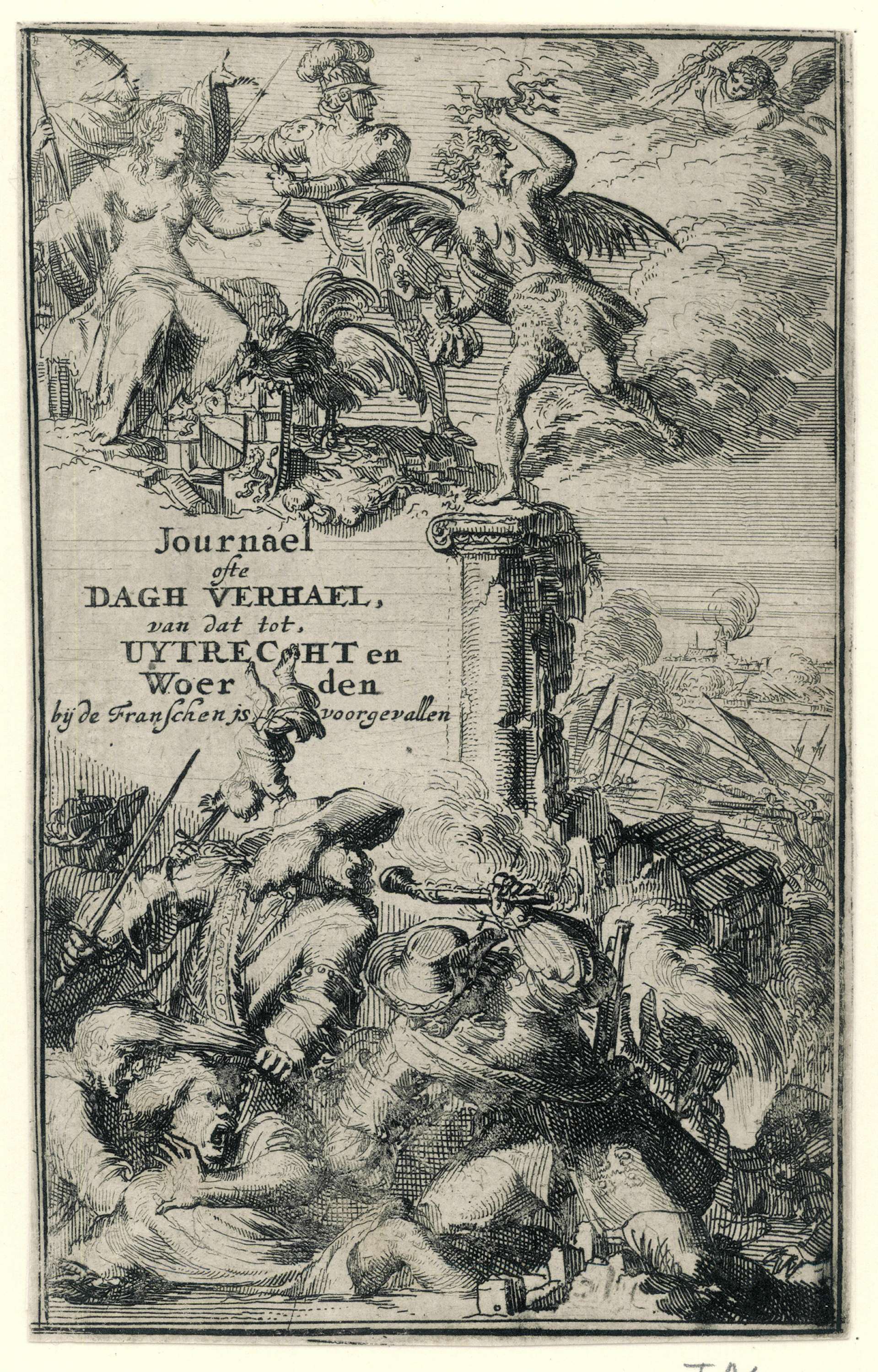 Titelprent voor het boek: Journael, of dagelijcksch Verhael van de handel der Franschen in de Steden van Uytrecht en Woerden, serdert hun koomst daer binnen, tot aan hun Vertrek, 1674. In de onderste deel van de voorstelling terroriseren Franse soldaten de bevolking. Hierboven een allegorische voorstelling met de Nederlandse Maagd die belaagd wordt door de ...