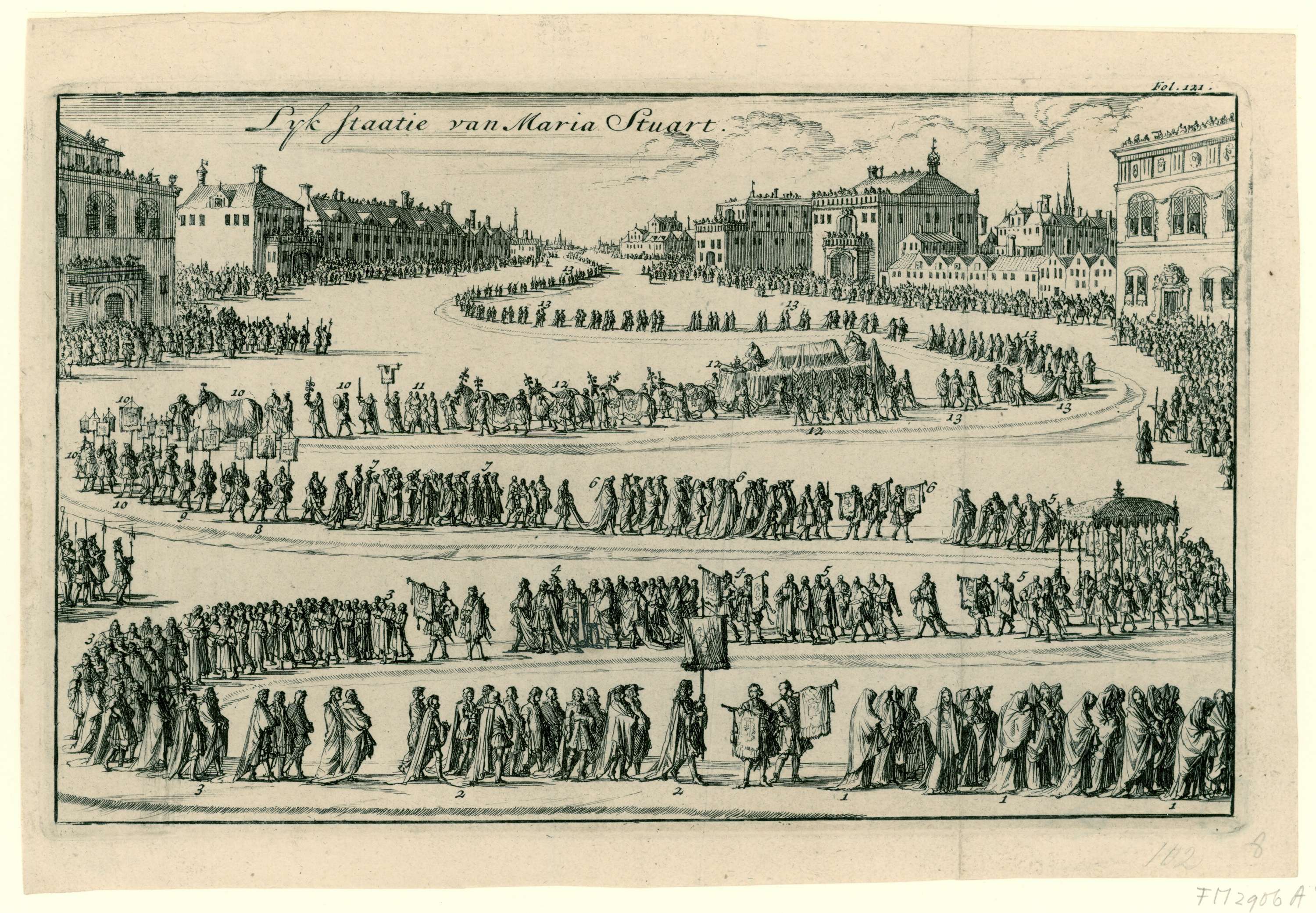 Kleine voorstelling van de lijkstatie van de overleden koningin Maria Stuart, gehouden in Londen op 5 maart 1695. Onderdelen van de stoet zijn genummerd, maar de legenda ontbreekt. Rechtsboven gemerkt: Fol. 121.