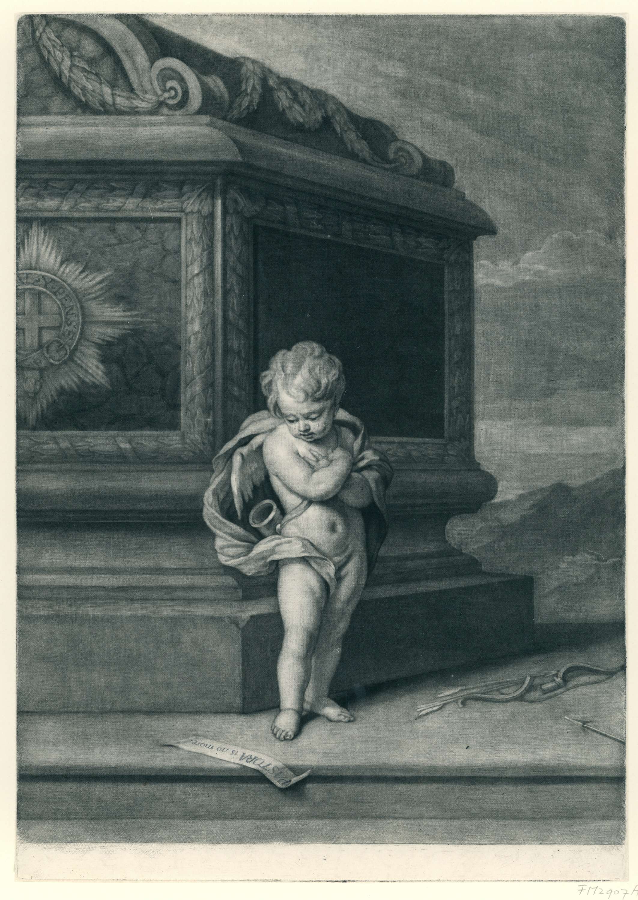 Allegorische voorstelling vervaardigd ter nagedachtenis aan Maria II Stuart, overleden op 7 januari 1695. Een treurende Cupido staat bij het graf van de koningin. Met een Latijns onderschrift onder de prent en de naam op de graftombe. Staat vóór de namen van de vervaardigers, het onderschrift en de naam op de graftombe. Op het strookje ...