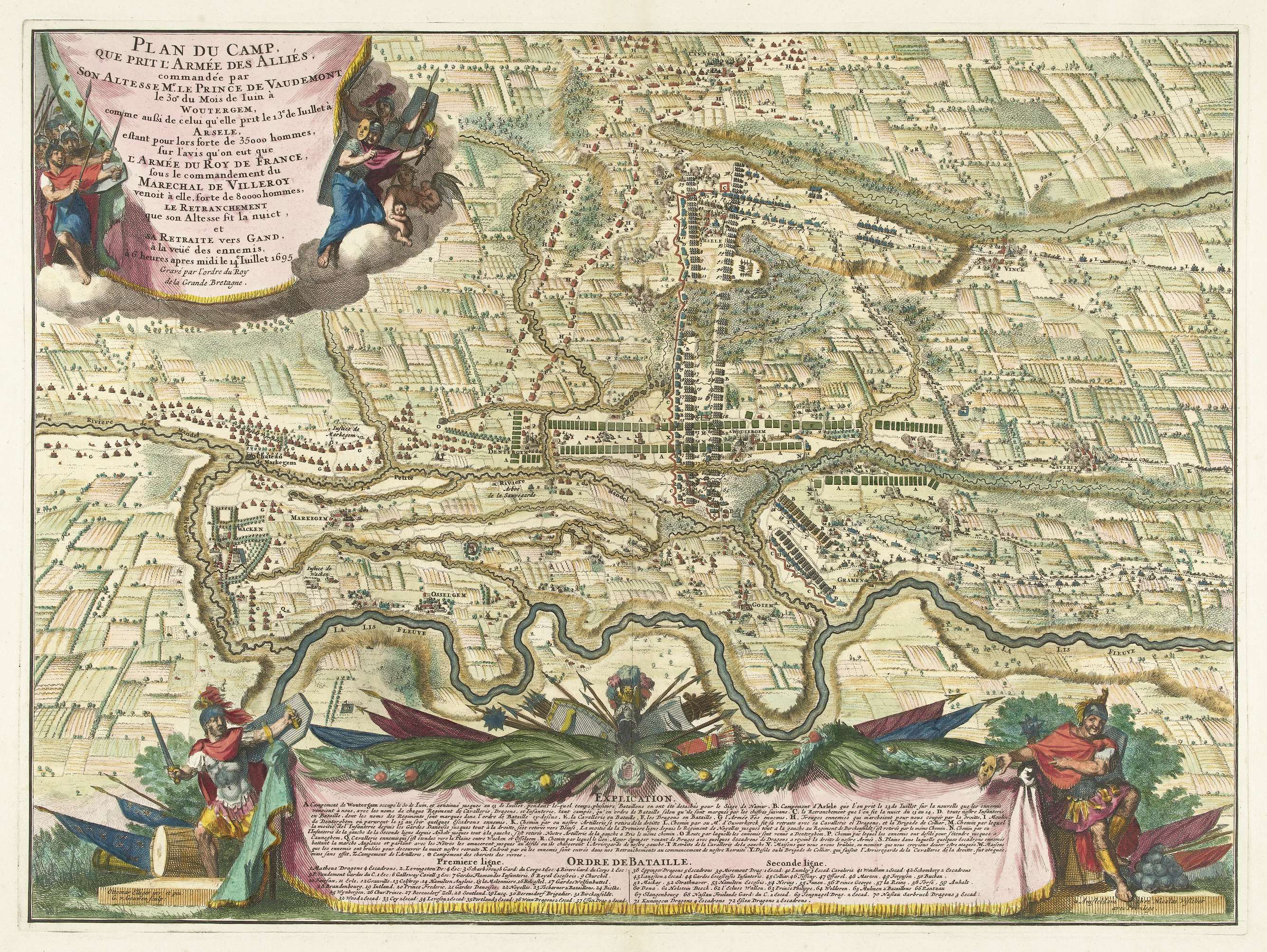 Ingekleurde kaart met de posities van de geallieerde en de Franse troepen gelegerd bij Wontergem en Aarsele, bij de rivier de Leie in West Vlaanderen in juni en juli 1695. Linksboven een cartouche met de titel, onderaan een cartouche versierd met wapentrofeeën en twee soldaten, met een verklaring van de voorstelling.
