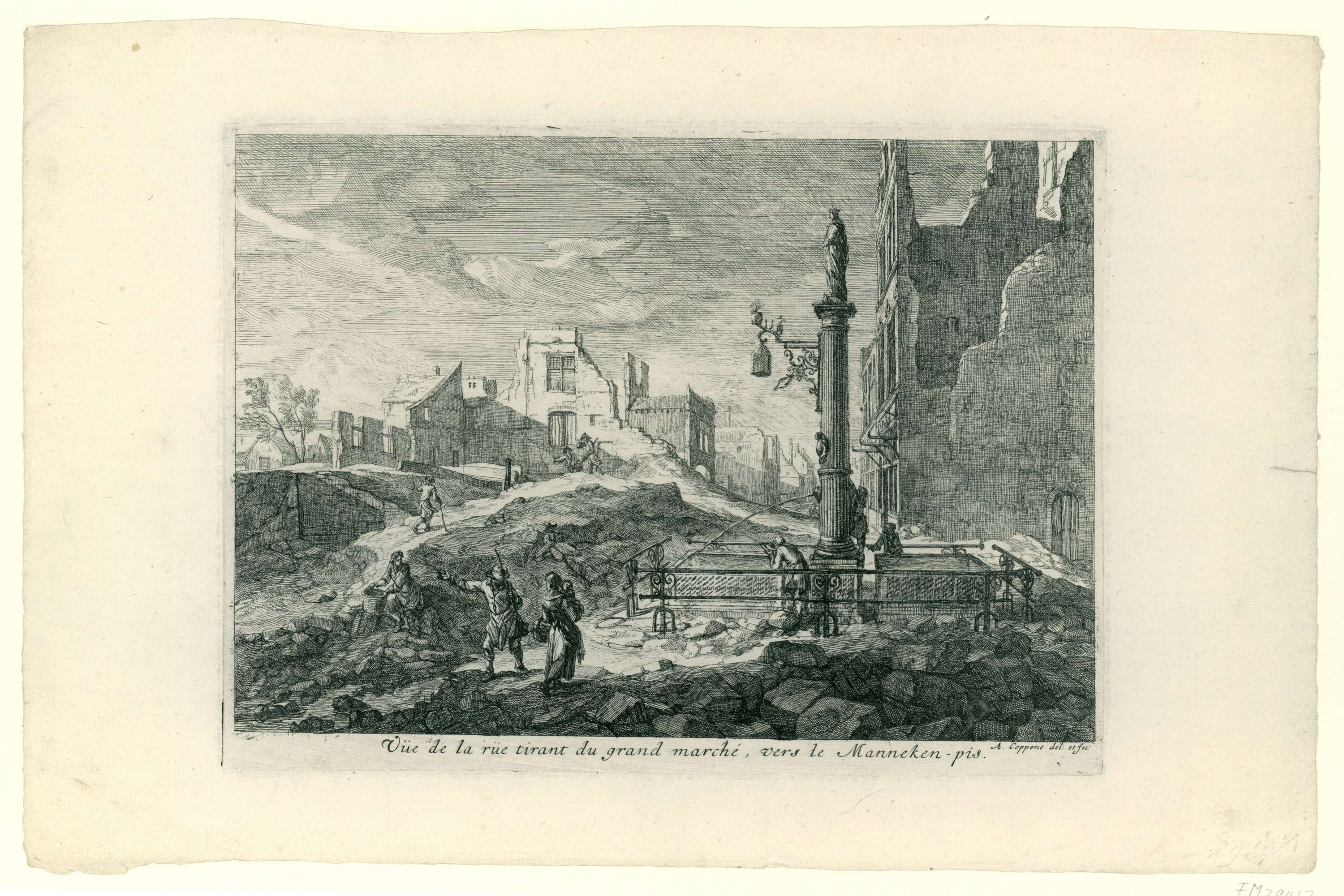 Voorstelling van de ruïnes in een straat naar de Grote Markt bij het Manneken Pis te Brussel na het bombardement door de Fransen, 13-15 augustus 1695. Zevende prent in de reeks van twaalf.