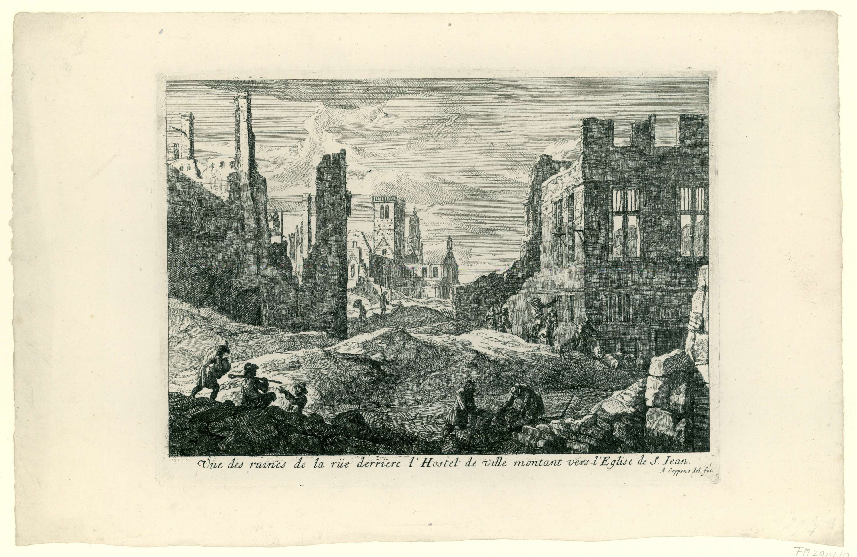 Voorstelling van de ruïnes achter het stadhuis tot aan de Sint Jan te Brussel na het bombardement door de Fransen, 13-15 augustus 1695. Tiende prent in de reeks van twaalf.
