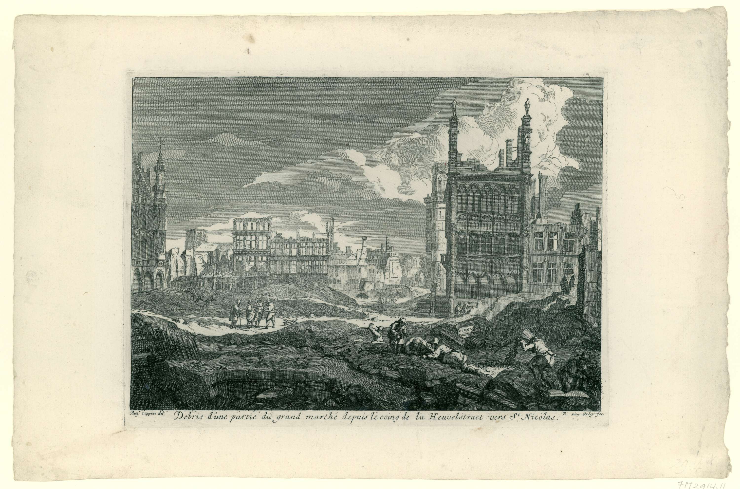 Voorstelling van de ruïnes op de Grote Markt tot aan de Heuvelstraat bij de Sint-Nicolaaskerk te Brussel na het bombardement door de Fransen, 13-15 augustus 1695. Elfde prent in de reeks van twaalf.