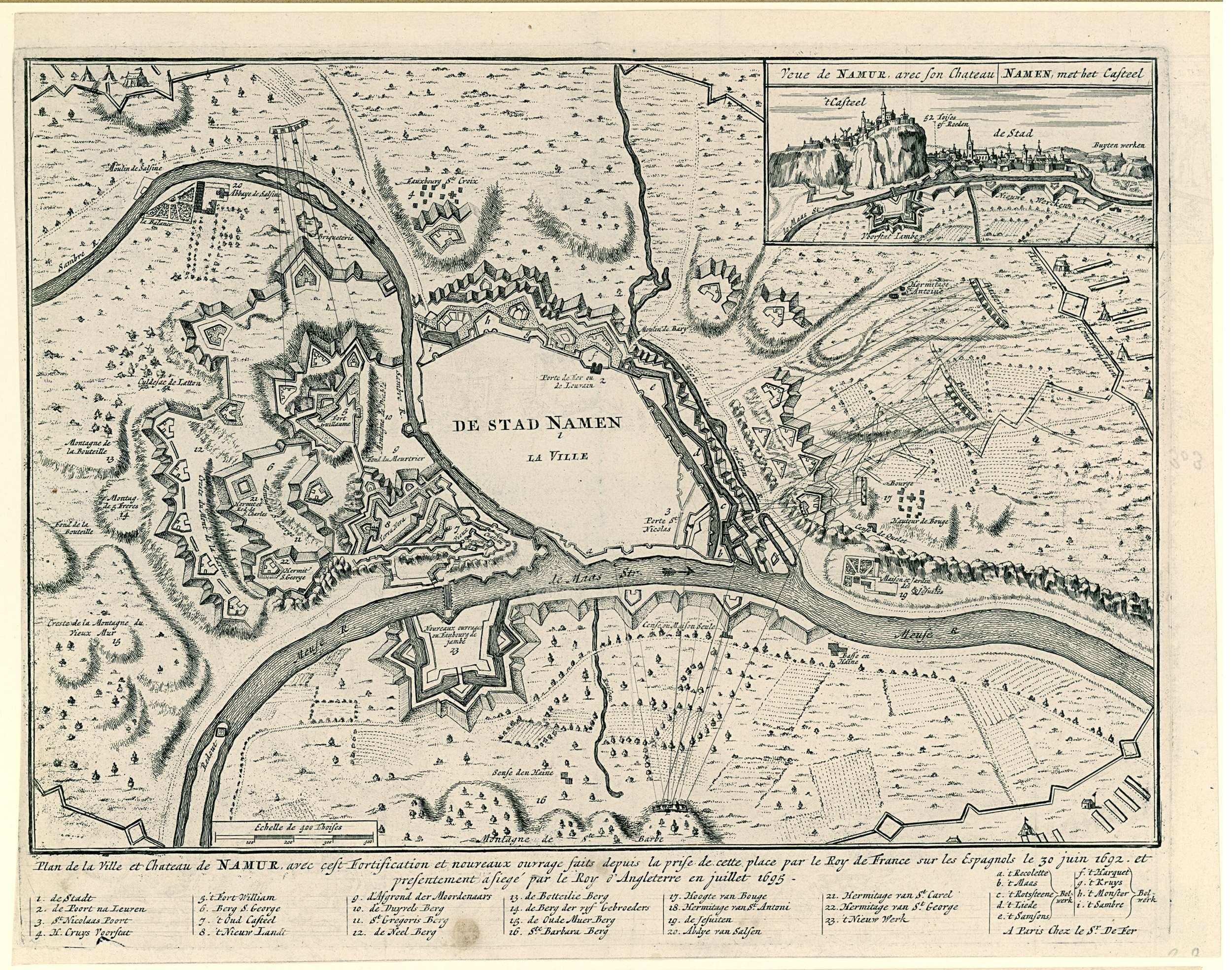 Plan van Namen en de directe omgeving met de posities van de belegerende geallieerde troepen en de schietlijnen van de batterijen. Rechts boven een inzet met een klein gezicht op de stad. Onder de prent een verklaring van de cijfers in het Nederlands.