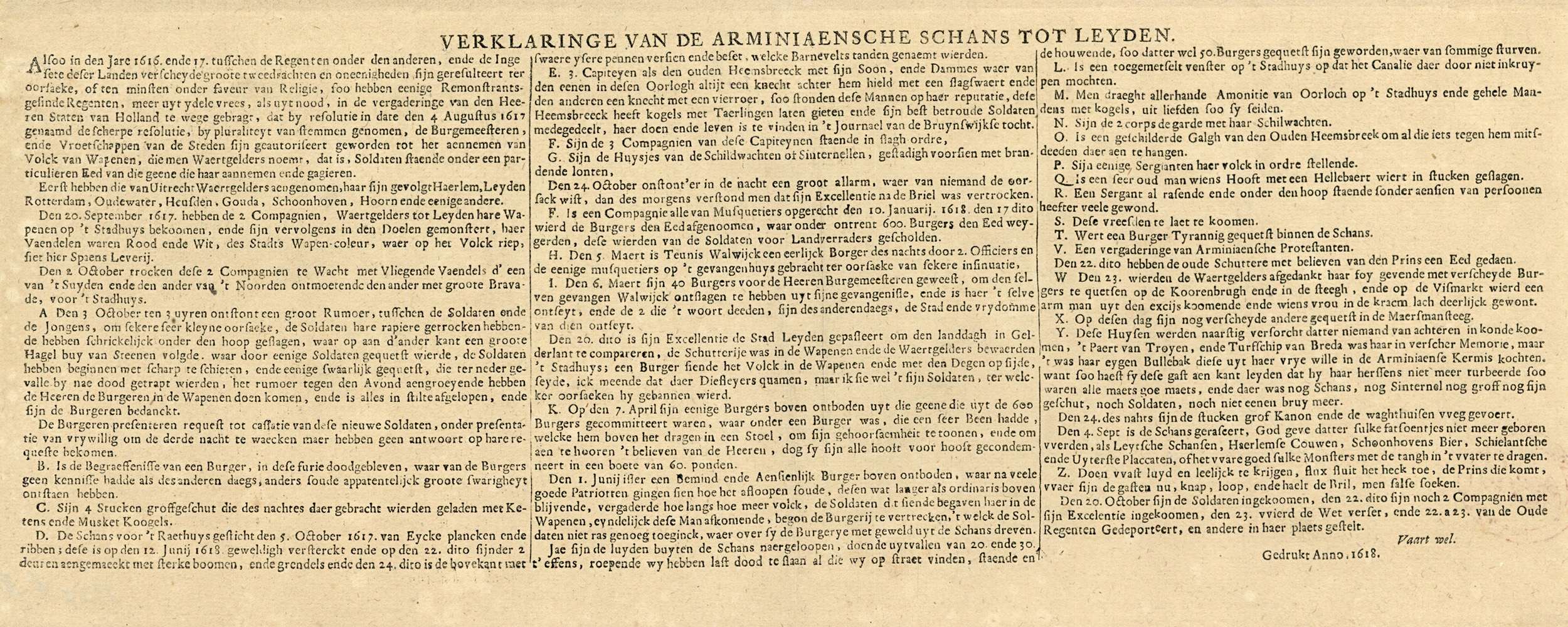 Tekstblad behorend bij de voorstelling van de arminiaanse schans te Leiden. De schans werd op 5 oktober 1617 in de Breestraat bij het stadhuis opgericht om de remonstrants gezinde vroedschap en waardgelders te beschermen. Het blad behoort bij de heruitgave van de prent, die verscheen met de naam van de uitgever en de datering 1618. ...