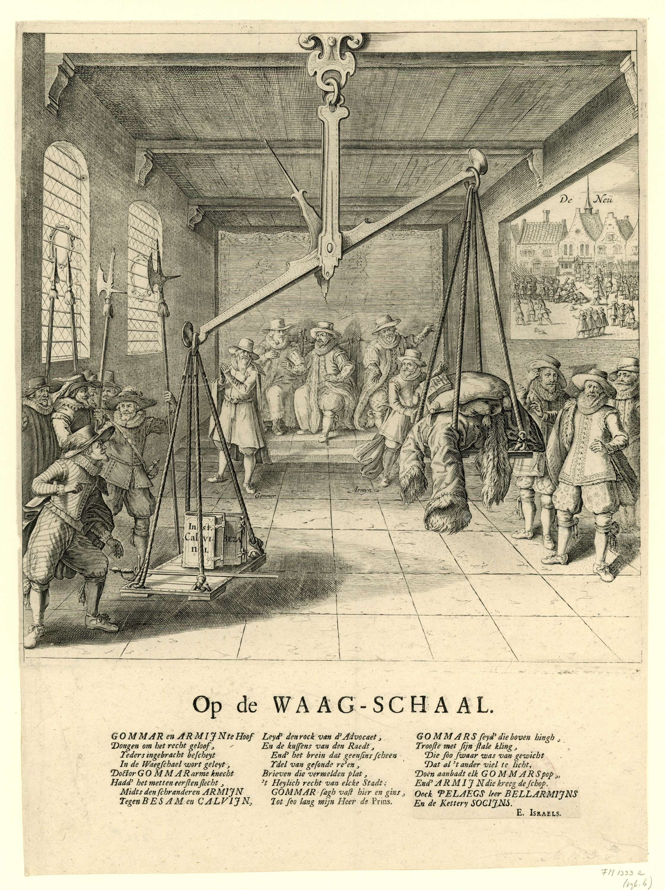 Politieke allegorie op de overwinning van de contraremonstranten dankzij het ingrijpen van prins Maurits, 1618. De voorstelling toont een interieur met een grote weegschaal. Hierop worden, in aanwezigheid van Gomarus, Arminius, Johan van Oldenbarnevelt en anderen, de argumenten van de contraremonstranten en de remonstranten tegen elkaar afgewogen. Maurits doet de balans ten gunste van de ...