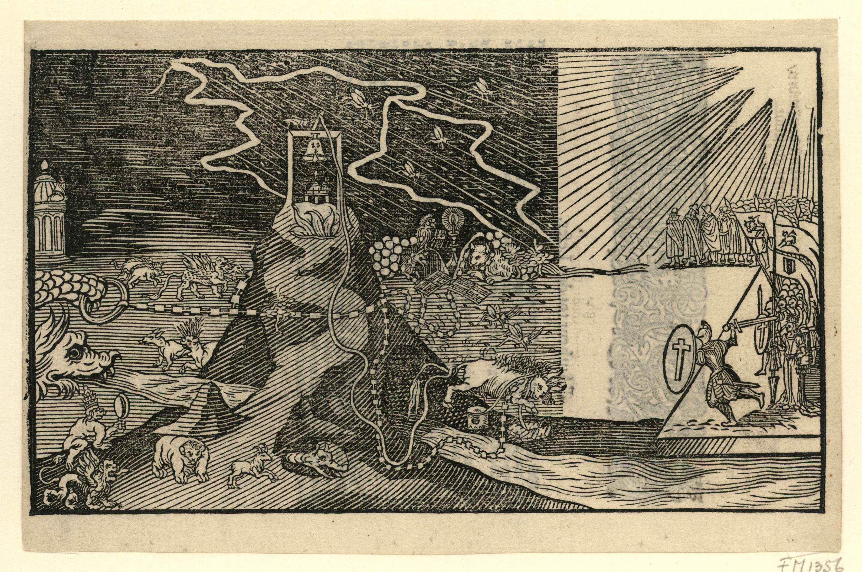 Spotprent op de Utrechtse remonstrantse predikant Jacobus Taurinus, 1615. Houtsnede waarin een dolle stier (Taurinus) door een nachtlandschap raast waarin allerlei apocalyptische dieren verschijnen. In de hemel onweer en bliksem. In het midden een klok bovenop een berg. Rechts verschijnt in het licht Gods de Christelijke ridder. Bedrukt op de achterzijde met tekst in het ...