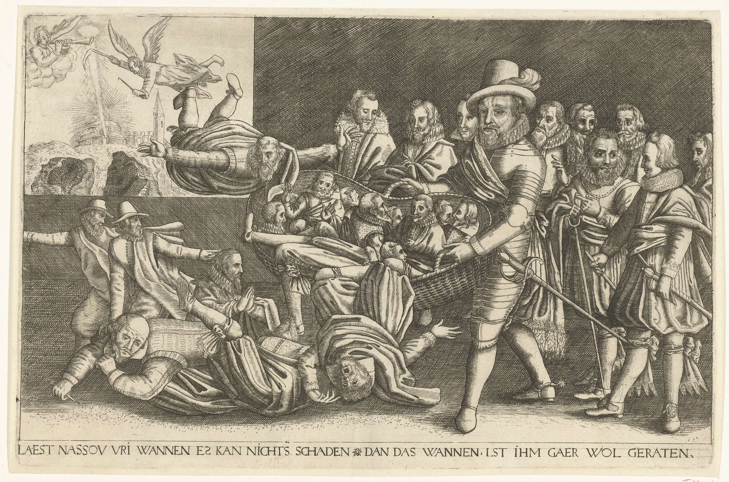 Spotprent op de val van Johan van Oldenbarnevelt en de remonstranten. Prins Maurits houdt een grote wan (mand) in zijn handen waaruit Johan van Oldenbarnevelt en zijn medestanders geschud worden. Links Gilles van Ledenberg die zichzelf van het leven berooft. Rechts in het gevolg van Maurits bevinden zich onder andere graaf Willem Lodewijk en Frederik ...