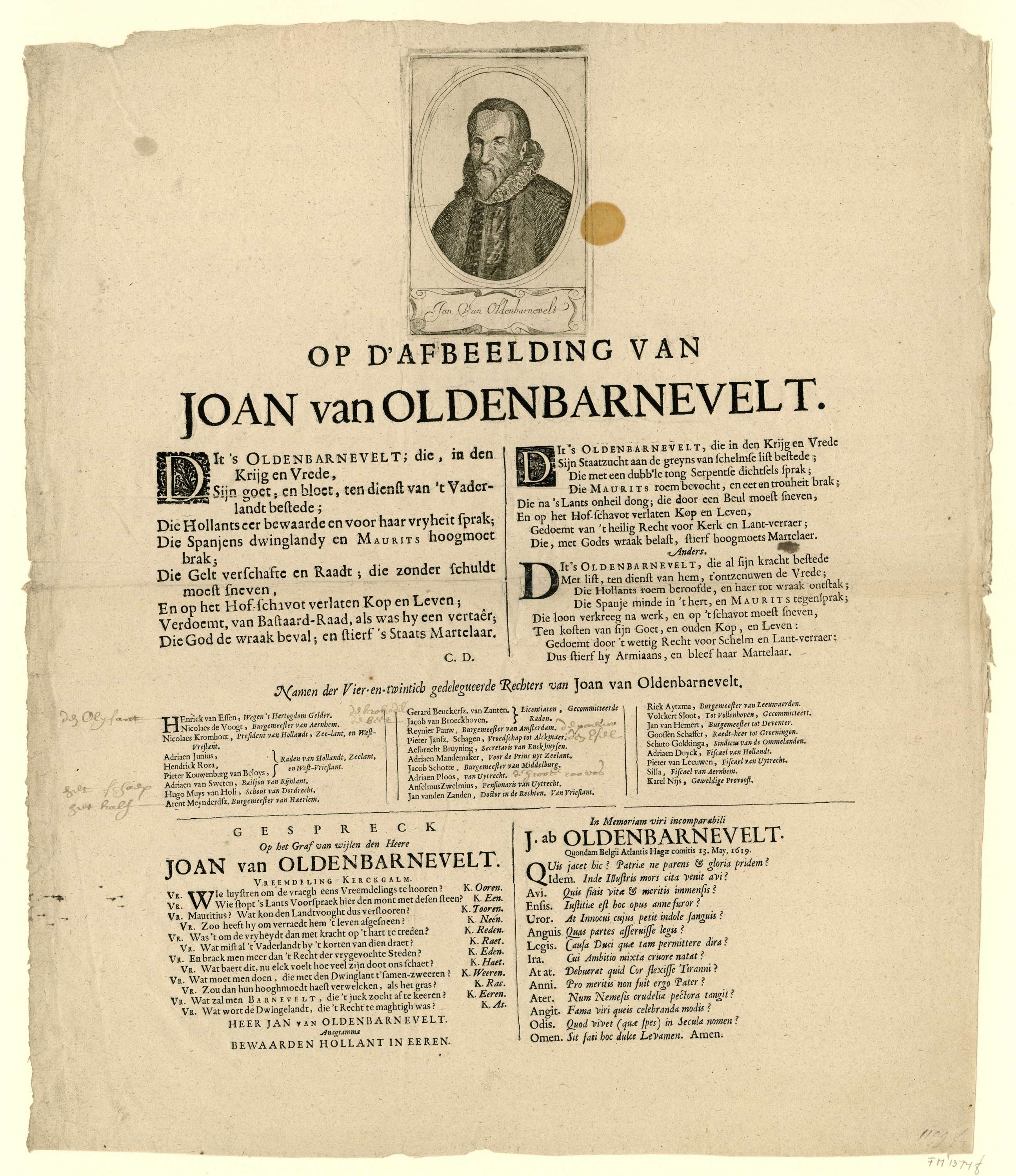 Blad met bovenaan een portret van Johan van Oldenbarnevelt, naar links. Daaronder twee kolommen met drie verzen op de afbeelding van Van Oldenbarnevelt. Het vers links prijst de landsadvocaat; de twee verzen rechts zijn in bewoording verwant aan de linker, maar hebben een tegenovergestelde inhoudelijke strekking. Onder de verzen staan de namen van de vierentwintig ...