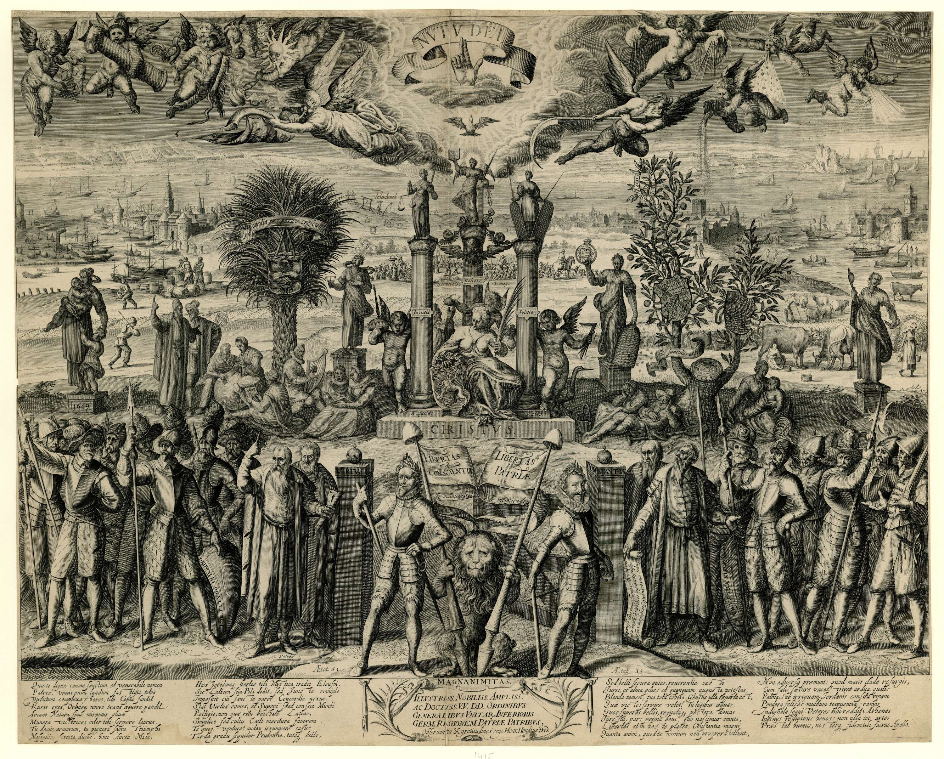 Allegorie op de welstand van de Republiek der Nederlanden in het jaar 1619. Uitvoerige allegorische voorstelling waarin de voorspoed van de Republiek onder het leiderschap van Maurits en Frederik Hendrik bejubeld wordt. De prinsen worden vergezeld door leden van de Staten-Generaal en soldaten. Hierachter de Nederlandse Maagd zittend op de hoeksteen Christus tussen de zuilen ...