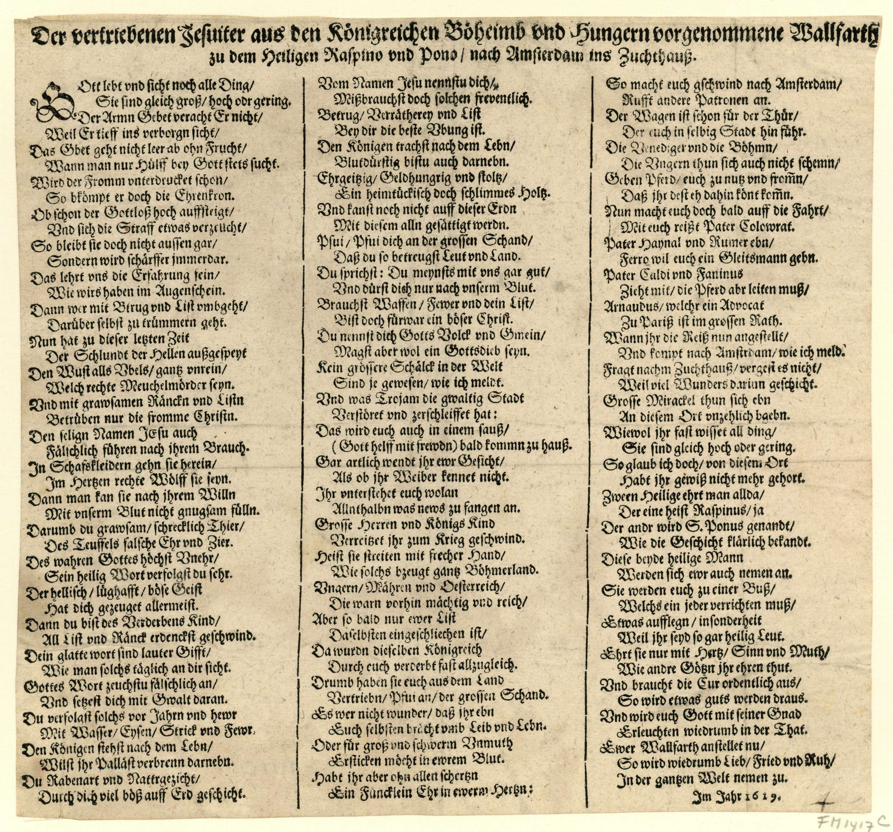 Tekstblad met een Duits vers over drie kolommen, behorend bij de spotprent met een voorstelling van de tocht van de in 1619 uit Bohemen en Hongarije verdreven jezuïeten naar het rasphuis in Amsterdam.