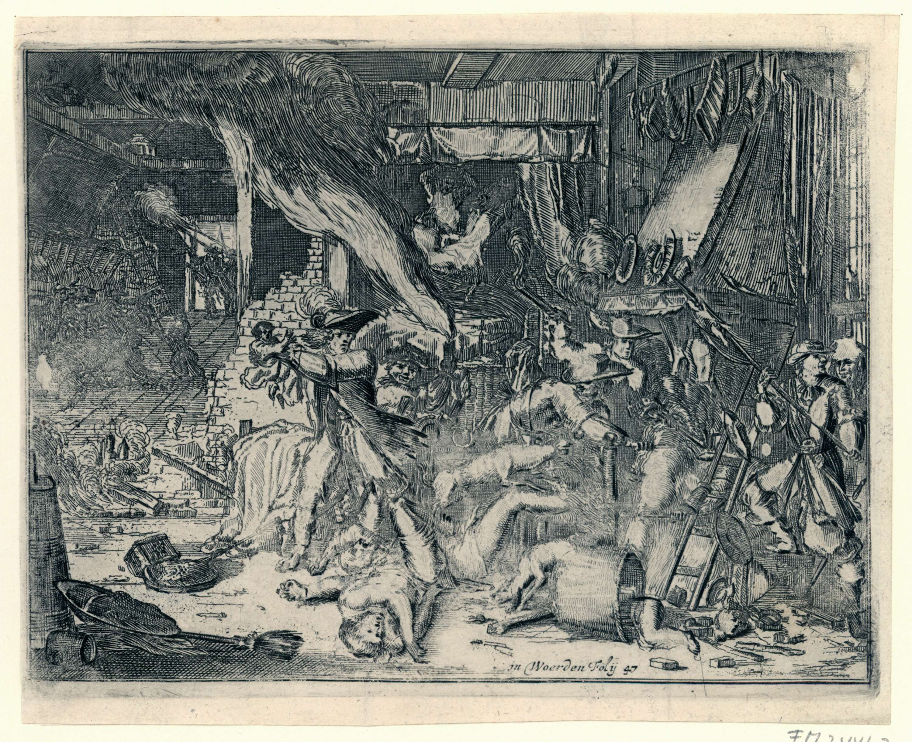 Voorstelling van de wreedheden gepleegd door de Franse troepen in Woerden in de winter van 1672. De prent is gekopieerd naar de ets van Romeyn de Hooghe uit 1673 (FM 2439/3). De voorstelling toont het interieur van een woning met rechts een haard en op de achtergrond een bedstee.