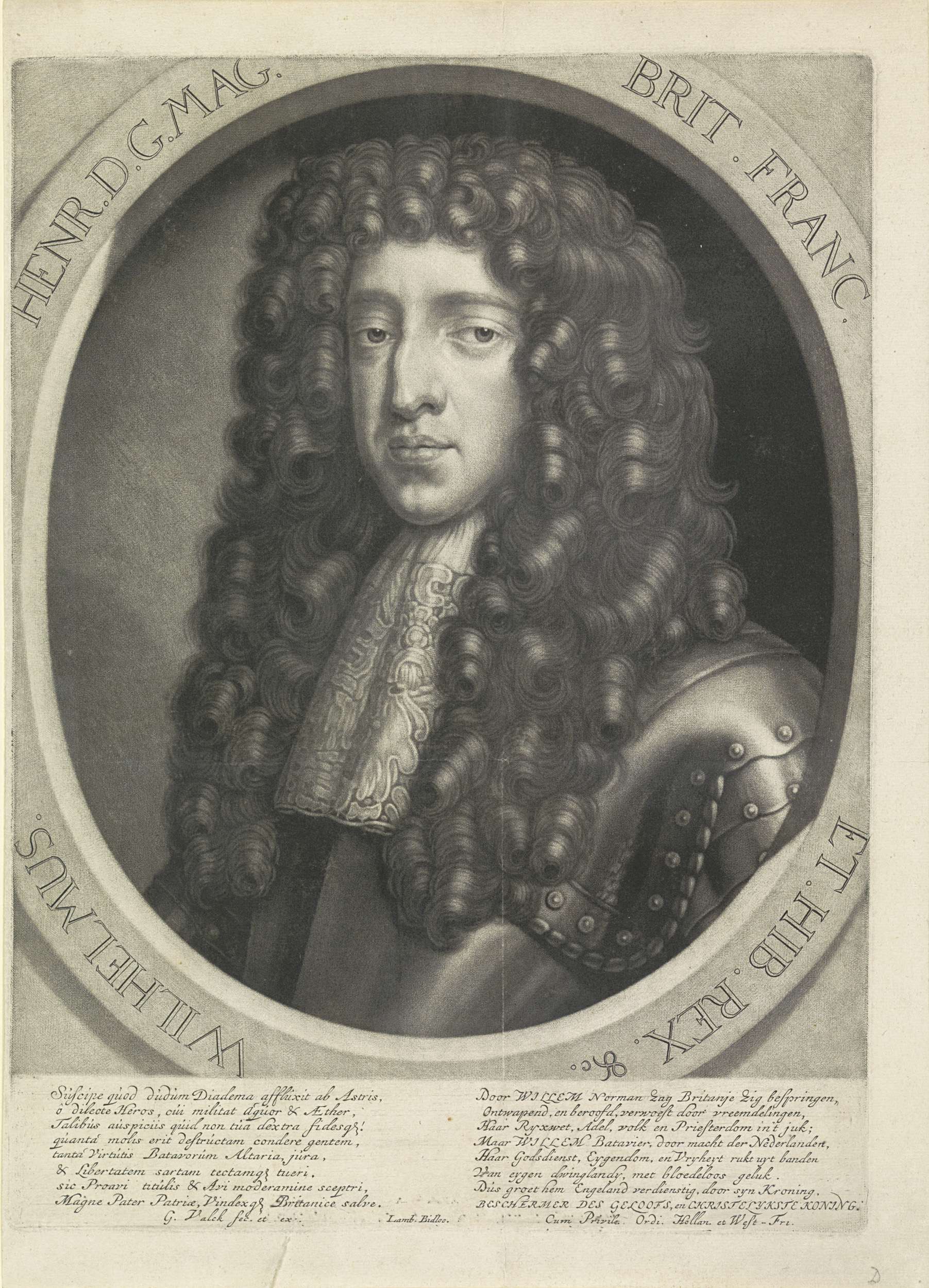 Portret van Willem III in een gebroken ovaal met randschrift. In de ondermarge acht regels Latijnse tekst en acht regels Nederlandse tekst.