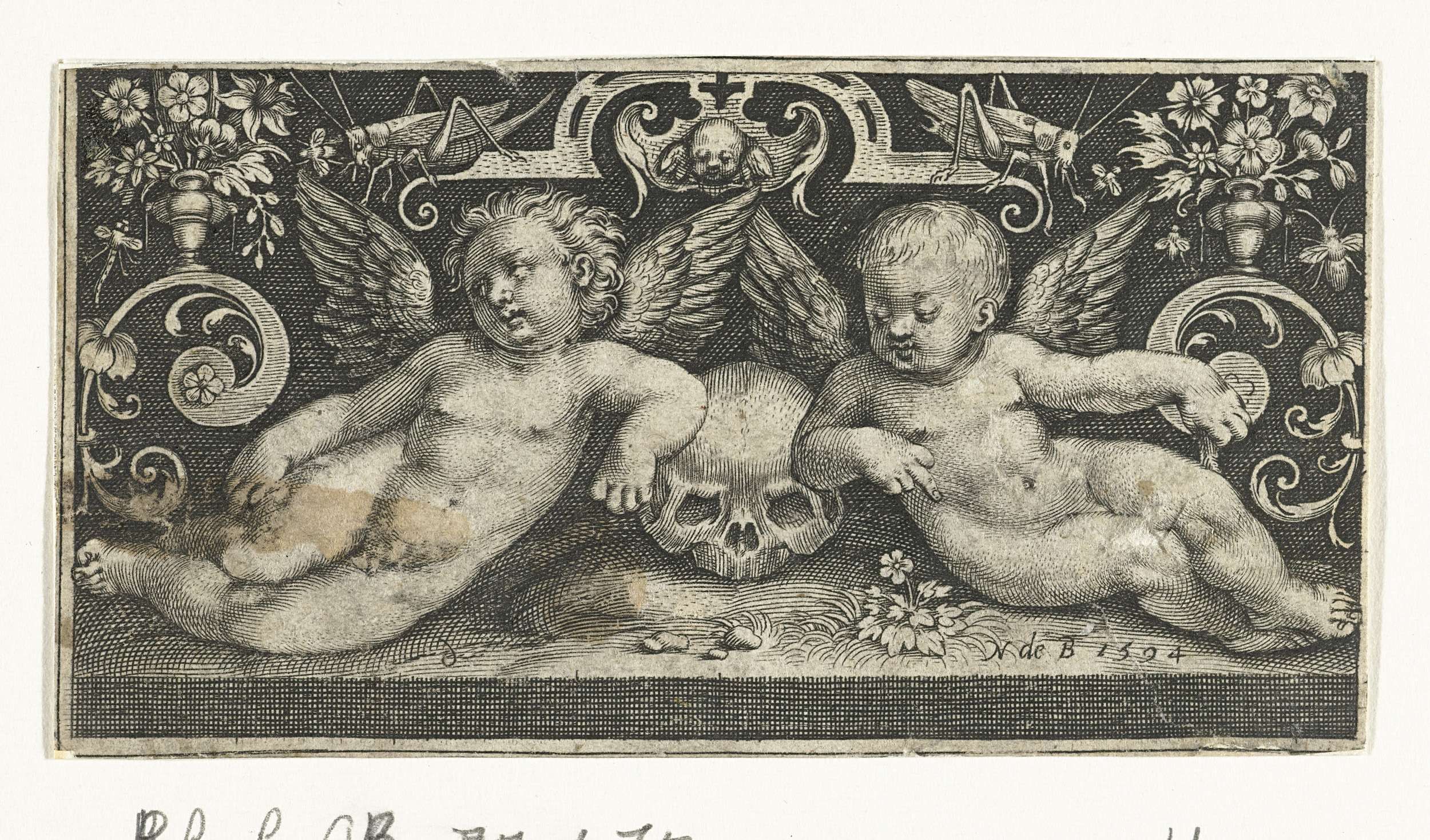 Twee liggende engeltjes leunen op schedel